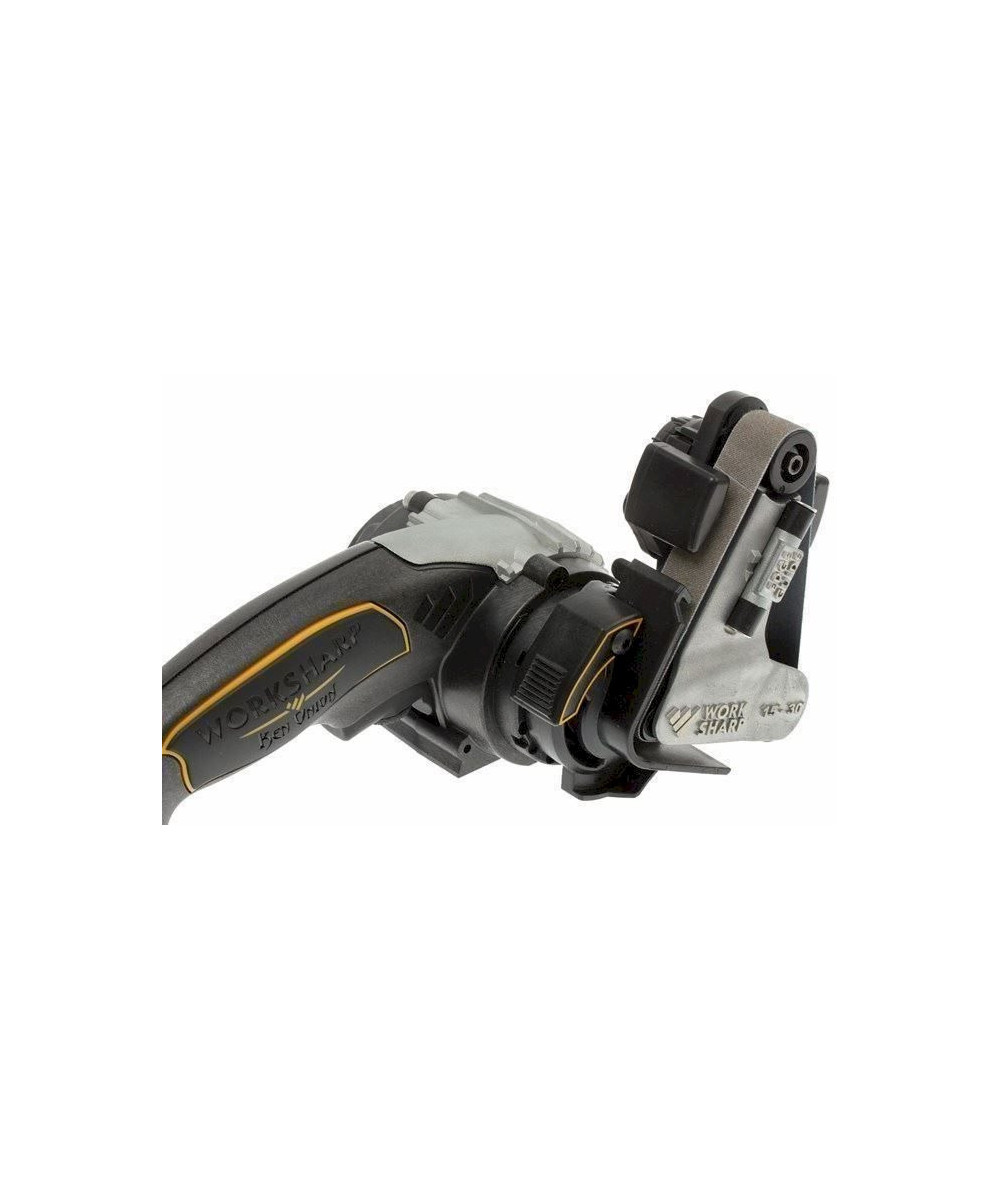 Durch die feiner einstellbaren Werte ergeben sich deutlich mehr Möglichkeiten der Klingenbearbeitung. Einfacher Bandwechsel ohne Werkzeug. Herunterklappbarer Schleifkopf für platzsparendes Verstauen.