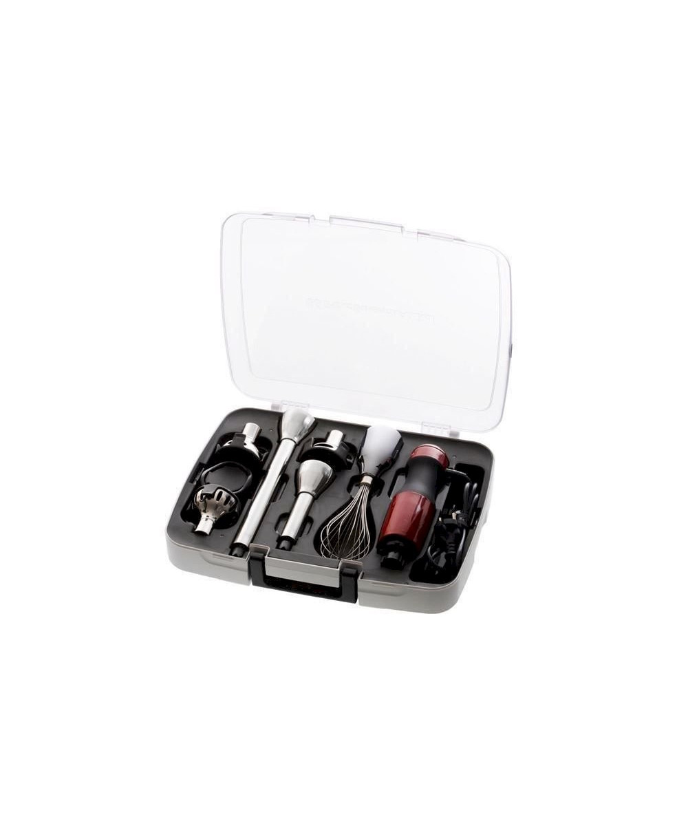 Lieferumfang Stabmixer, 2 Mischarme, S-Messer, Sternmesser, Schäummesser, Topfschutz, 3 Messerschütze, 1-L-Behälter mit Skala, Zerhacker, Chrom-Schneebesen, Aufbewahrungsbehälter