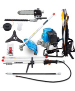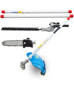 Das umfangreiche Set beinhaltet die Motoreinheit und Hochentaster, Rasentrimmer , Motorsense und Heckenscherenaufsatz.
