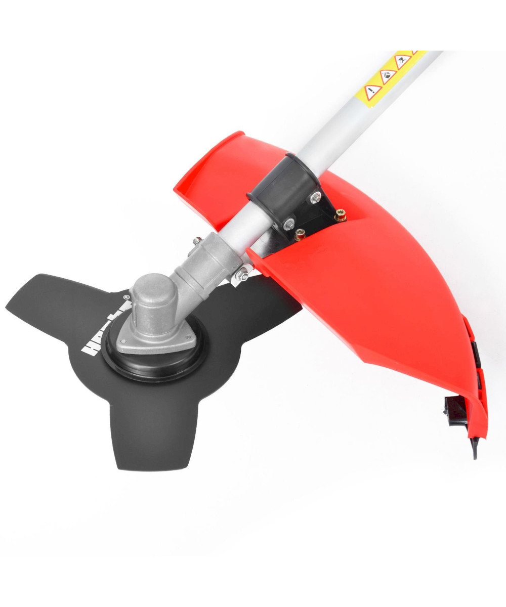 Das mitgelieferte 3-Zahn-Messer schneidet auch verwilderte und leicht verholzte Grünflächen. Es hat einen Schnittkreisdurchmesser von 25,5 cm . Mit dem 2-Faden-Schneidsystem ist der Freischneider als Rasentrimmer zum Schneiden von Ecken und Kanten ausgerüstet. Die Fadenlänge wird durch eine vollautomatische Fadennachführung und Fadenverlängerung mit Auftipp-Automatik reguliert. Der Schnittkreis geht bis zu einem Durchmesser von 43 cm.