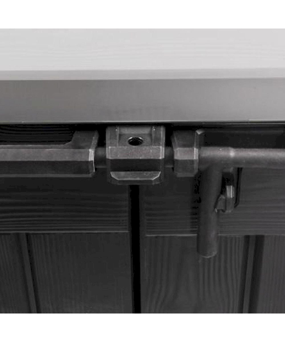 Der Allrounder ist aus hochwertigem Kunststoff gefertigt und schützt seinen Inhalt zuverlässig. Die bruchsicheren und dicken Kunststoffwände sorgen nicht nur für Langlebigkeit der Box selbst, sondern schützen auch den Inhalt. Wasser perlt an dem wetterfesten Kunststoff ab und der mitgelieferte Boden schirmt vor Bodennässe ab. Der Innenraum bleibt so trocken und ist auch gegenüber starken Temperaturschwankungen unempfindlich . Dank der durchdachten Bauweise sind Ihre Geräte nicht nur vor Schädlingen und Ungeziefer geschützt , sie können auch vor Diebstahl gesichert werden, da alle drei Türen per Vorhängeschloss (nicht im Lieferumfang enthalten) abgeschlossen werden können.