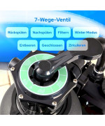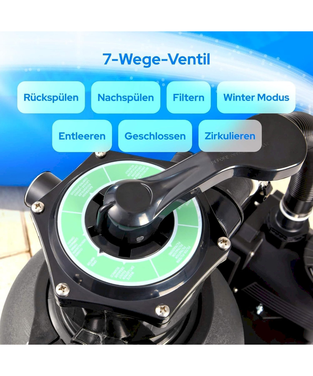 Gesteuert wird das System bequem über ein integriertes 7-Wege-Multifunktionsventil, das alle wichtigen Funktionen wie Filtern, Rückspülen, Nachspülen, Entleeren, Zirkulieren, Schließen und Überwintern abdeckt. Die kompakte Bauweise, der praktische Vorfilter sowie das integrierte Manometer ermöglichen eine einfache Handhabung und Wartung.