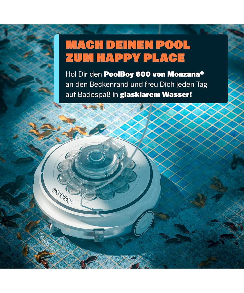 Schwimmen, Abtauchen oder im Liegestuhl entspannen - das alles kannst Du, während der smarte Poolboy seine Arbeit macht. Der automatische monzana® Poolroboter für große und kleine Schwimmbecken und Pools reinigt völlig kabellos durch seinen kraftvollen Ansaugmotor in bis zu 3 Metern Arbeitstiefe.