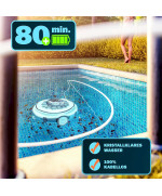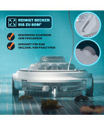 Der kabellose Poolsauger arbeitet nur am Boden - Du kannst während der Reinigung ungestört im Pool schwimmen. Mit einer kraftvollen Förderleistung von 80 L/min hast Du genug Leistung, um eine Grundfläche bis zu 80 m² zu reinigen. Die Ladestation und ein Filternetz aus Edelstahl für Kleinpartikel sind inklusive.