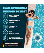 Freu Dich auf kristallklares Wasser ohne Rückstände und Schmutzpartikel wie Sand, Steinchen, abgesunkene Blätter, Flockungen und andere Verunreinigungen. Der mit Akku betriebene Poolroboter fährt mit intelligentem Navigationssystem über den Boden und sorgt für Sauberkeit. Seine weichen Bodenlamellen wirbeln mikrofeine Partikel auf, die anschließend das Filtersieb durchlaufen und lose ins Wasser zurück gelangen, um dann von Deiner Sandfilteranlage ausgefiltert zu werden. Profilierte, weiche Gummi-Haupträder, ein kantenloses Design und spezielle Bodenlamellen schützen den Poolboden.