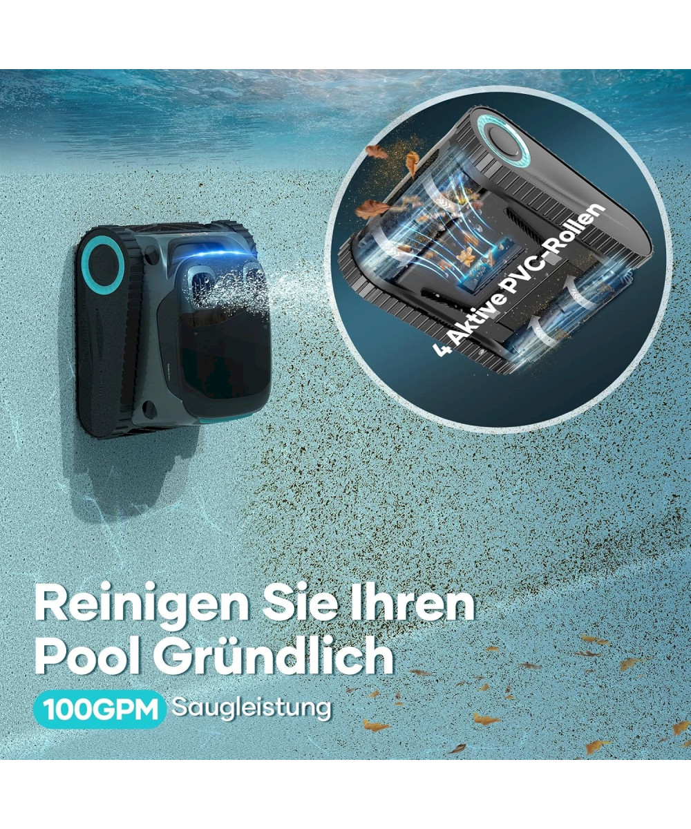 Der Scuba S1 Pro ist mit aktiven Doppel-PVC-Rollen und einem leistungsstarken Quad-Brushless-Motorsystem ausgestattet, das maximale Reinigungskraft für gründliches Schrubben und Saugen bietet. Der robuste Raupenantrieb ermöglicht müheloses Navigieren auf unebenen Poolböden und das Erklimmen von Wänden mit einem Winkel von bis zu 90°±15°