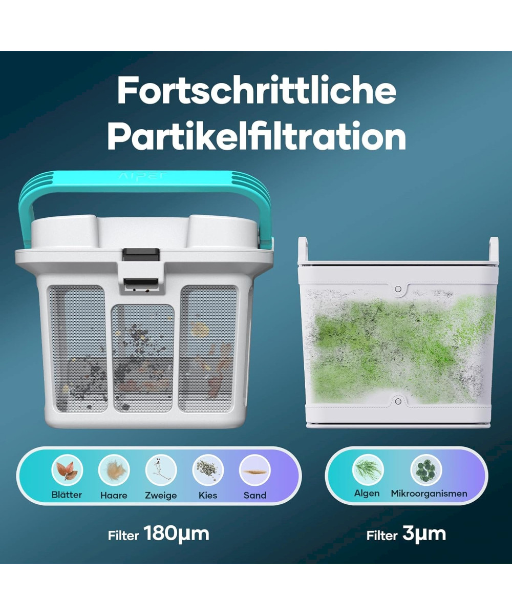 Ausgestattet mit einem großzügigen 5-Liter-Primärfilter (180 Mikron) und einem Sekundärfilter (3 Mikron), erfasst der Scuba S1 Pro selbst feinste Partikel und verbessert die Wasserqualität erheblich. Die Reinigung der Filter ist denkbar einfach: Deckel öffnen, Filter entnehmen, abspülen – fertig - Fünf vielseitige Reinigungsmodi