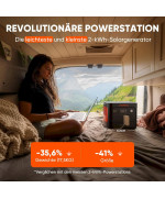 - [Kompakteste & leichteste 2kWh-Powerstation] - Jackery E2000 v2 wiegt nur 17,5 kg und ist die erste 2-kWh-Powerstation mit der innovativen CTB-Technologie. Diese sorgt für ein sicheres und kompaktes Design. Im Vergleich zu anderen 2-kWh-Solargeneratoren ist sie 41 % kleiner und 35,6 % leichter. Mit Tragegriff perfekt geeignet für Camping, Wohnmobile oder Stromausfälle.
