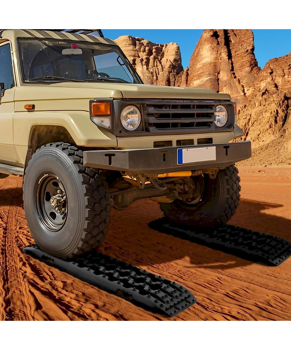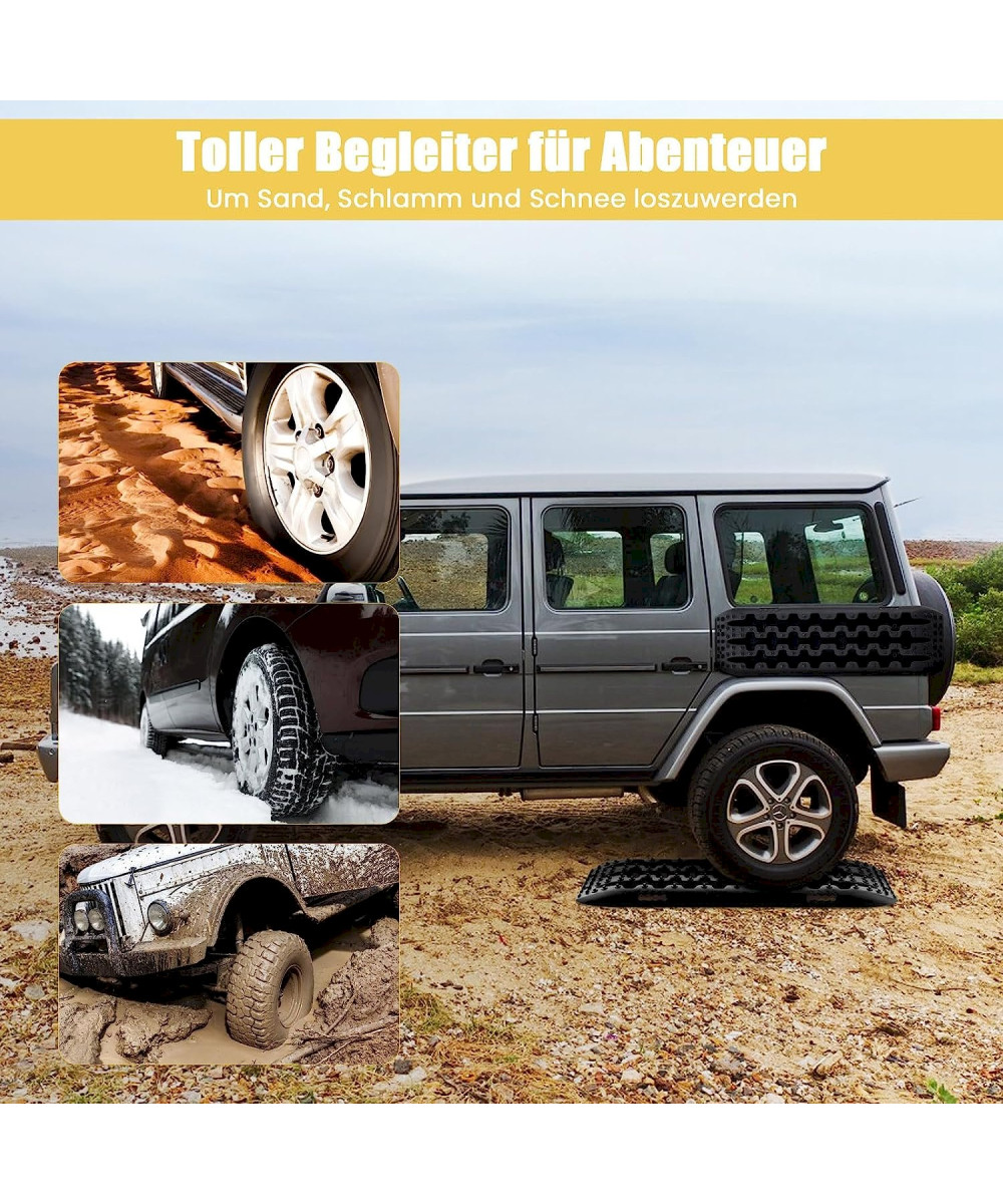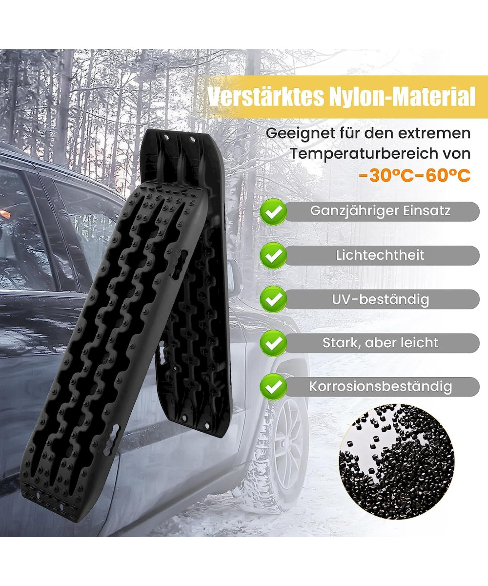 Das Paket enthält 2 Offroad-Traktionsbretter. Jede Bergungstraktionsschiene besteht aus robustem, aber leichtem Nylonmaterial und kann bis zu 10 Tonnen tragen und extremen Temperaturen von -30 °C bis 60 °C standhalten. Diese hochbelastbare Traktionsmatte ist außerdem superflexibel, biegsam und bricht nicht so leicht. Beide Seiten der Reifenleiter sind mit Stollen und Zähnen versehen, um die Reibung zwischen Reifen und Boden zu erhöhen und so ein Durchdrehen der Fahrzeugreifen zu verhindern.