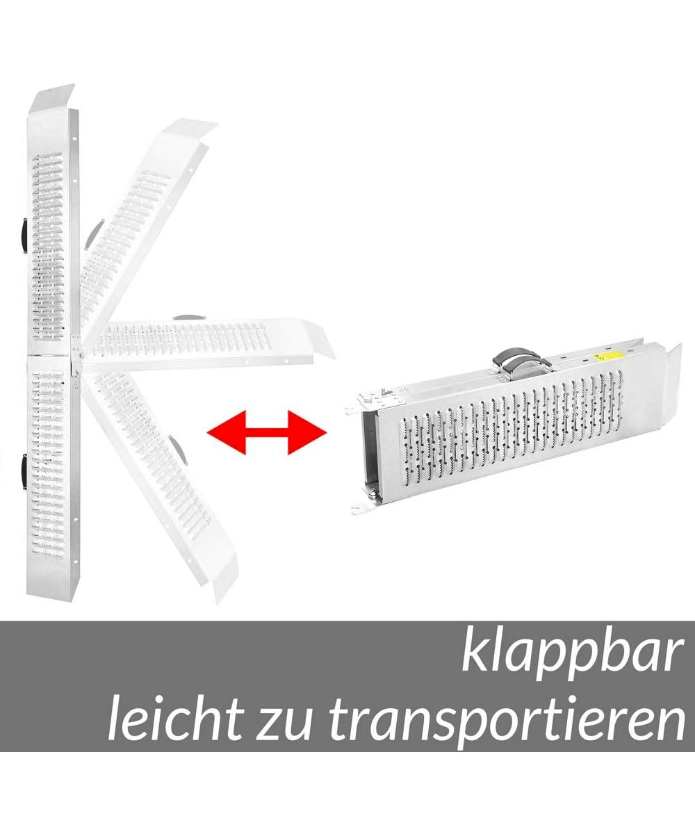 Die klappbare Rampe mit bequemem Tragegriff lässt sich einfach transportieren und ist dank ihres geringen Klappmaß einfach zu verstauen. Mit einem Eigengewicht von nur 7,5 kg lässt sich die Rampe bequem transportieren.