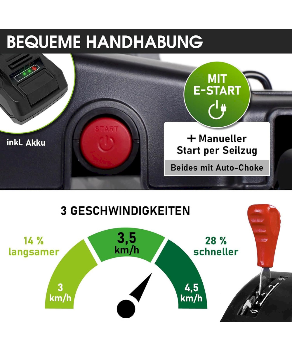 - Start wahlweise manuell über Seilzug oder über Elektrostart-Funktion per Knopfdruck