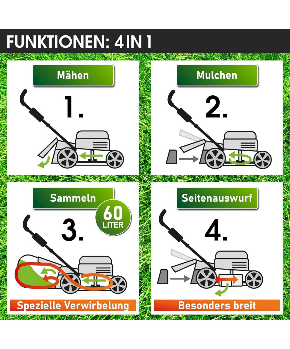 - 4in1: Mähen, Mulchen, Sammeln und Seitenauswurf