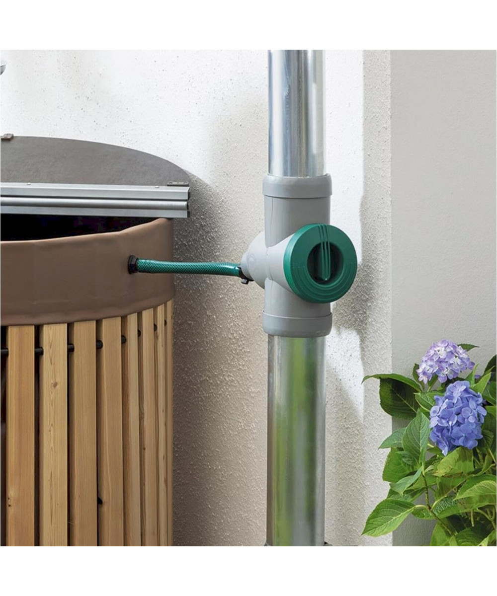 Der Filter-Füllautomat wird einfach in das Fallrohr eingebaut. Der integrierte, leicht zu reinigende Edelstahlfilter mit einer Maschenweite von 0,7 x 1,7 mm säubert das Wasser, bevor es in das Regenfass gelangt.