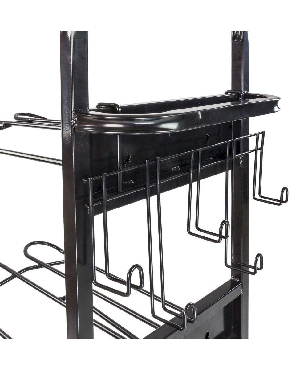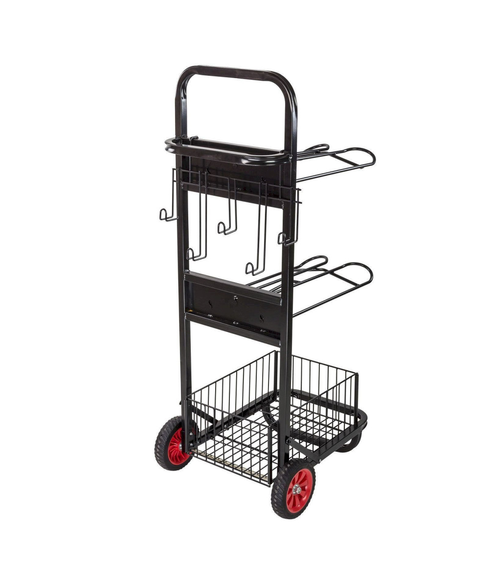 So können Sie platzsparend gleich 2 Sättel fachgerecht und sicher aufbewahren und z.B. von der Stallung in den Sattelraum transportieren. Für eine leichte Bestückung und Entnahme können Sie jeden Halter separat ein- / aushängen. Die 5 Langhaken nehmen Trense, Zaumzeug und Longierleine, der untere Kleinteilekorb Pflegemittel für Sättel und weitere Kleinteile auf. Das stabile Metallrohrgestell hält den anfallenden Belastungen problemlos stand. Und steht mal ein Transport im Kofferraum an, lässt sich Ihr neuer Sattelwagen problemlos zusammenklappen.
