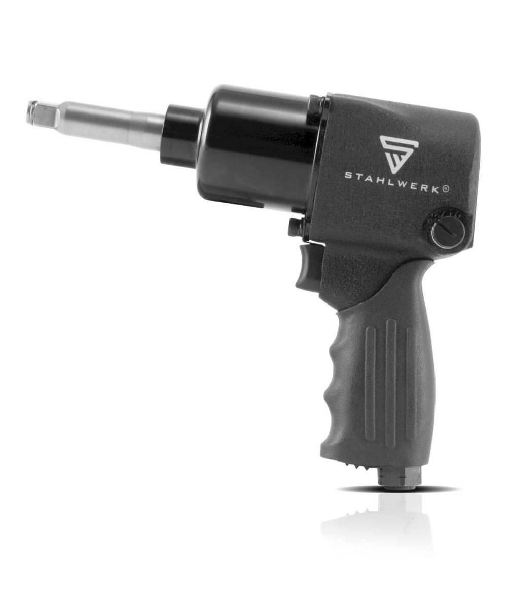 Der robuste und kompakte Druckluft-Schlagschrauber mit langer 1/2 Zoll Aufnahme von STAHLWERK ist die ideale Ergänzung für die Druckluft-Ausrüstung in der Werkstatt. Der robuste Drehschlagschrauber erreicht ein maximales Drehmoment von 881 Nm und eine maximale Drehzahl von 7.000 Umdrehungen pro Minute. Durch die lange Vierkant-Aufnahme lässt sich der Drehschlagschrauber an schlecht zugänglichen Stellen oder zurückliegenden Schraubverbindungen einsetzen. Der Rechts- Linkslauf ist einhändig schaltbar. Sowohl im Rechts- als auch im Linkslauf lässt sich die Drehzahl in 5 Stufen schalten. Dank des ergonomischen Griffs liegt das Druckluft-Werkzeug sehr solide in der Hand und erfüllt höchste Ansprüche beim Einsatz in der Werkstatt. Der Druckluft-Drehschlagschrauber eignet sich daher sehr gut für anspruchsvolle Montage und Demontage-Arbeiten in KFZ- oder Maschinenbaubetrieben. Das robust ausgelegte Hochleistungs-Schlagwerk des Druckluft-Schlagschraubers ist in einem hochwertigen Stahlguss-Gehäuse eingesetzt und sorgt für einen kontinuierlichen Aufbau des geforderten Drehmoments. Die hochwertige Verarbeitung sorgt für hohe Standzeiten sowie eine lange Werkzeugverfügbarkeit.