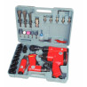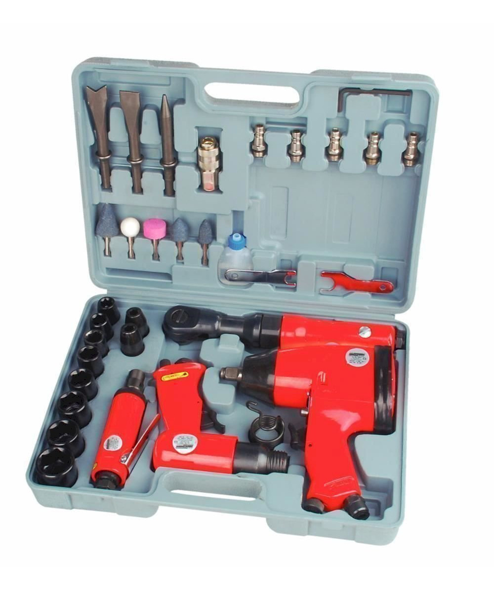 12,5 mm (1/2”) Druckluft-Schlagschrauber , Umschaltung für Rechts-/Linkslauf, Schlagkrafteinstellung durch Regulierschraube, max. Drehmoment: 320 Nm, Luftverbrauch: 140 l/min, Betriebsdruck: ca. 6 bar. 12,5 mm (1/2”) Druckluft-Ratschenschrauber , Umschaltung für Rechts-/Linkslauf, hohes Anlaufdrehmoment, Drehzahlregulierung, max. Drehmoment: 68 Nm, Luftverbrauch: 110 l/min, Leerlaufdrehzahl: 150 U/min, Betriebsdruck: ca. 6 bar. Druckluft-Meißelhammer , Schlagkrafteinstellung, Luftverbrauch: 110 l/min, Meißelhub: 41 mm, Betriebsdruck: ca. 6 bar. Druckluft-Stabschleifer , Drehzahlregulierung, max. Drehzahl: 25 000 U/min, Luftverbrauch: 110 l/min, Betriebsdruck: ca. 6 bar · 3 Meißel (Flach-, Spitz- und Trennmeißel) · Haltefeder für Druckluft-Meißel · 5 keramische Schleifstifte mit 6 mm-Schaft · 5 Schnellwechsel-Adapter · Winkelschraubendreher, Innensechskant · Schnellkupplung · 2 Montageschlüssel · Ölspritzflasche · 10 Schlagnüsse aus Chrom-
