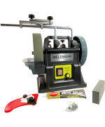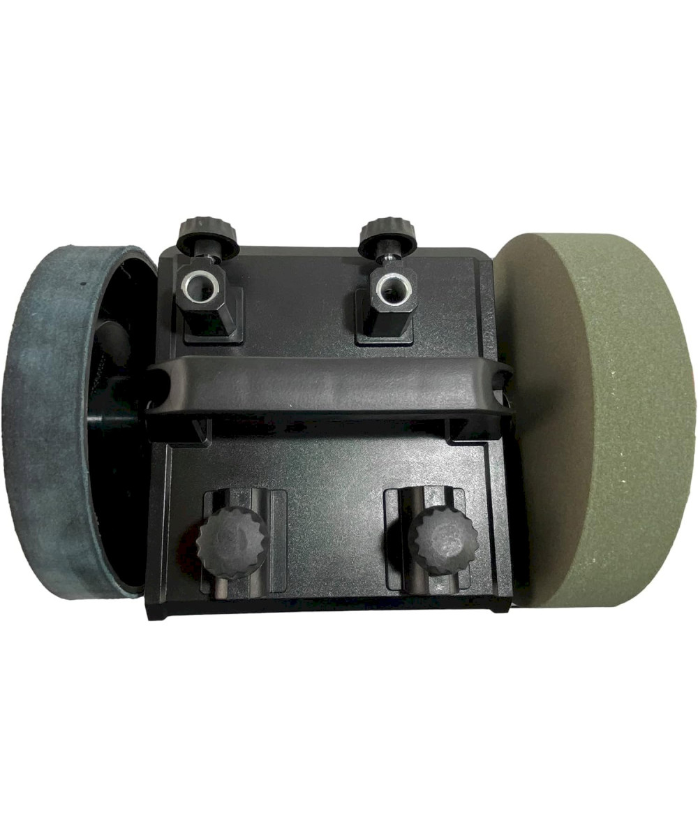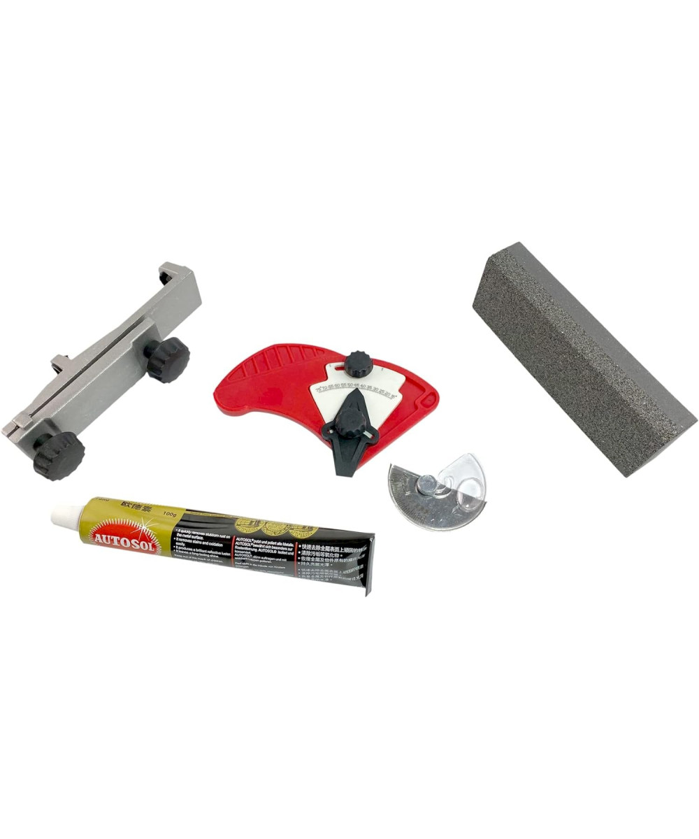 Außer dem Schleifstein sind alle Anbauteile bequem werkzeuglos per Rändelschraube auswechsel- oder verstellbar. Im Zusammenspiel mit der beiliegenden Winkellehre erlaubt dies schnelle, sehr genau justierbare Schleifwinkel und ein zügiges Arbeiten mit unterschiedlichen Aufsätzen und Klingenformen.