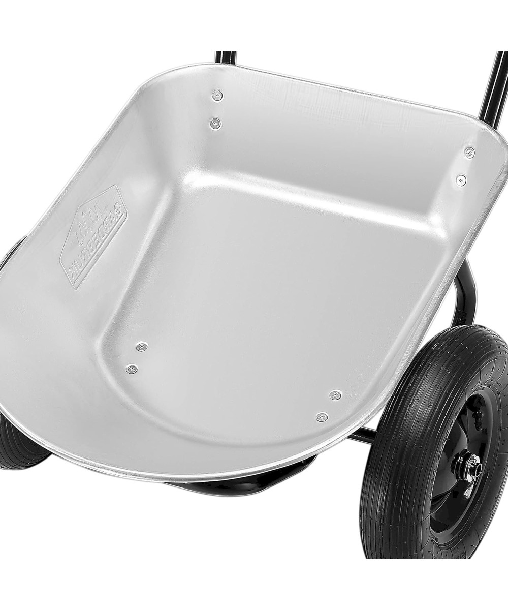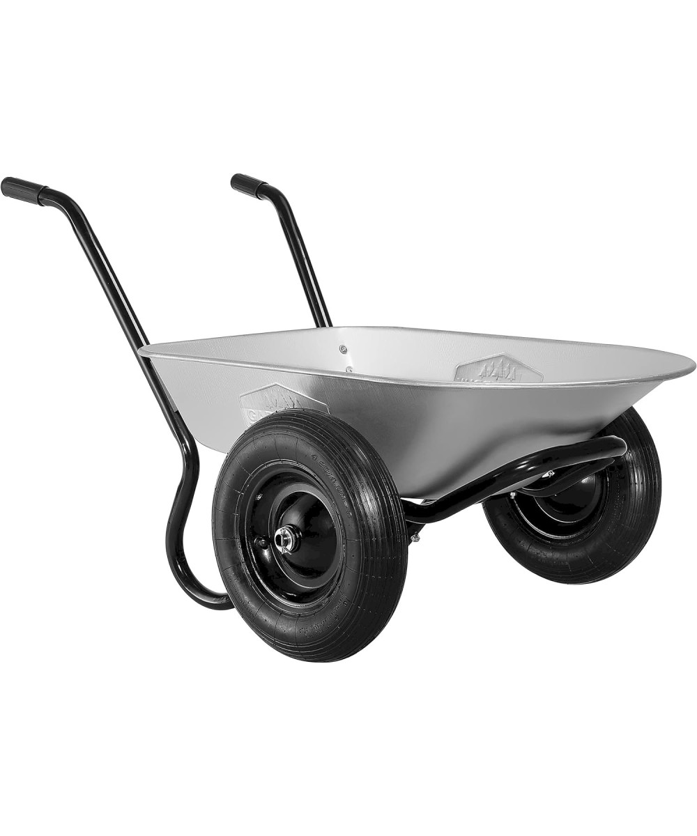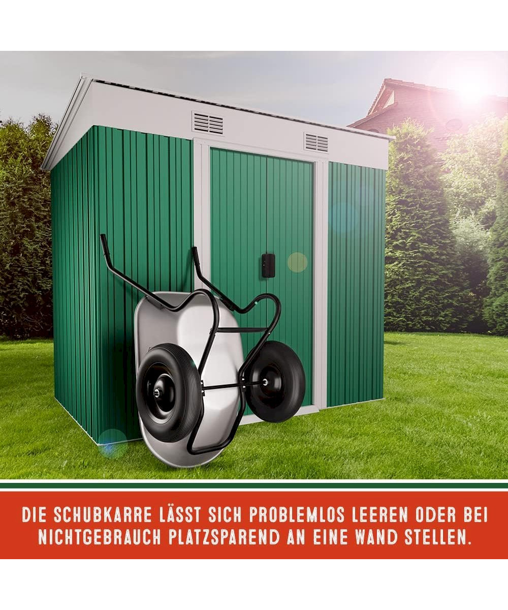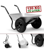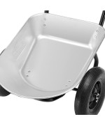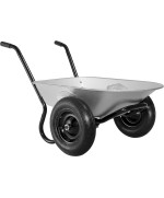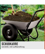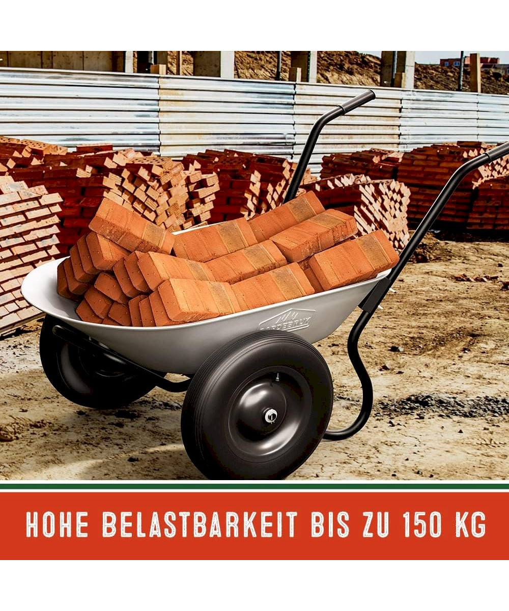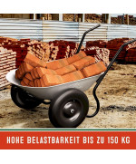 Die beiden Reifen sorgen für eine höhere Stabilität und einfachem Fahren auch bei unebenem Gelände. Ausgestattet ist die Schubkarre mit komfortablen Gummigriffen und einem stabilen Stahlrahmen.