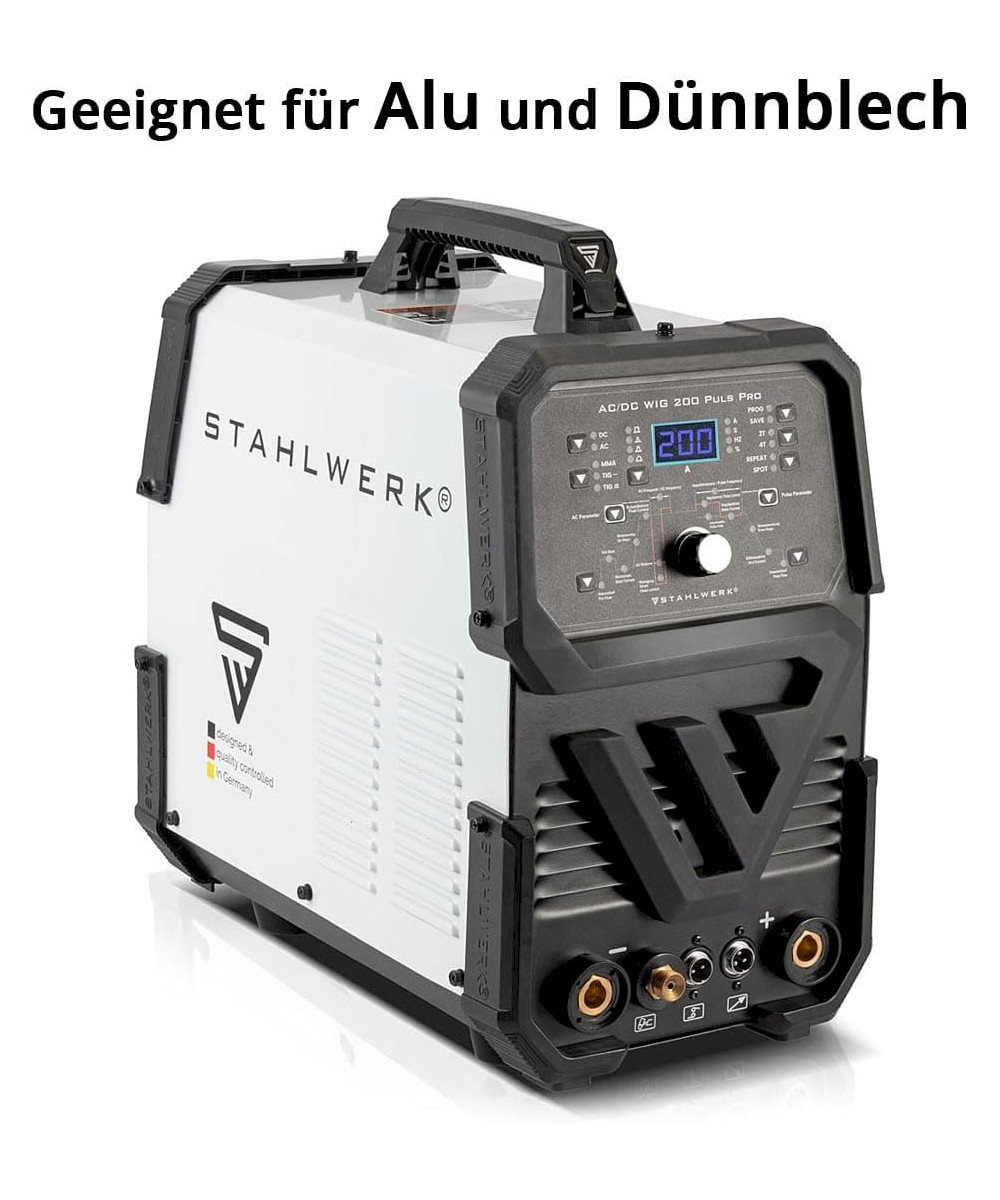 Die STAHLWERK AC/DC WIG 200 Puls Pro ist ein multifunktionales WIG-Schweißgerät mit MMA- bzw. Elektrodenschweißfunktion, das dank fortschrittlicher Pulsweitenmodulation (PWM) und modernster IGBT-Technologie ein relativ geringes Gewicht und ausgezeichnete Schweißeigenschaften bei einem reduzierten Stromverbrauch bietet. Darüber hinaus überzeugt das Kombi-Schweißgerät beim Schweißen von Aluminium und Dünnblech. Das vielseitige Inverter-Schweißgerät verfügt über ein digitales Bedienfeld mit umfangreichen Funktionen und Einstellmöglichkeiten für DC MMA-, DC WIG, AC WIG-, DC- und AC-Impuls Schweißverfahren. Durch die fortschrittliche Pulsweitenmodulation (PWM) ist durch das Hochfrequenz-Pulsen mehr Kontrolle und ein besserer Einbrand bei einem reduzierten Stromverbrauch mit bis zu 500 Hz möglich. Über den am Brenner montierten Drehregler lässt sich jederzeit komfortabel der Schweißstrom einstellen. Neben einem umfangreichen Zubehörpaket wird das STAHLWERK AC/DC WIG 200 Puls Pro Digital Schweißgerät - wie alle STAHLWERK-Geräte - mit einer 7-jährigen Garantie ausgeliefert.