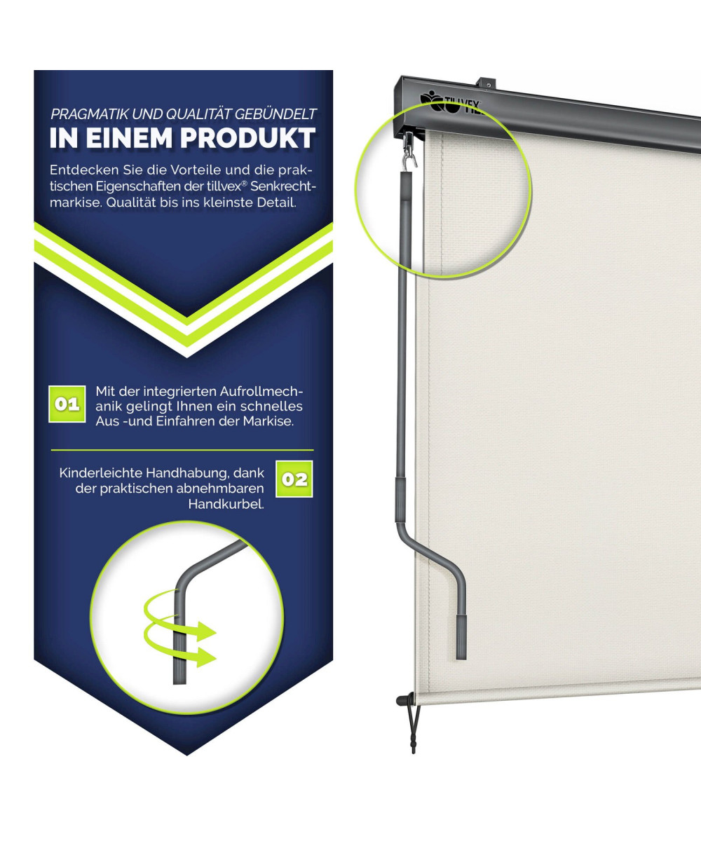 Die abnehmbare Handkurbel ermöglicht eine bequeme Anpassung der Höhe der Markise, während das robuste Material ein müheloses Auf- und Abrollen gewährleistet. Passen Sie Ihre Gartenmarkise mit wenigen Handgriffen an Ihre Bedürfnisse an und genießen Sie maximalen Komfort.