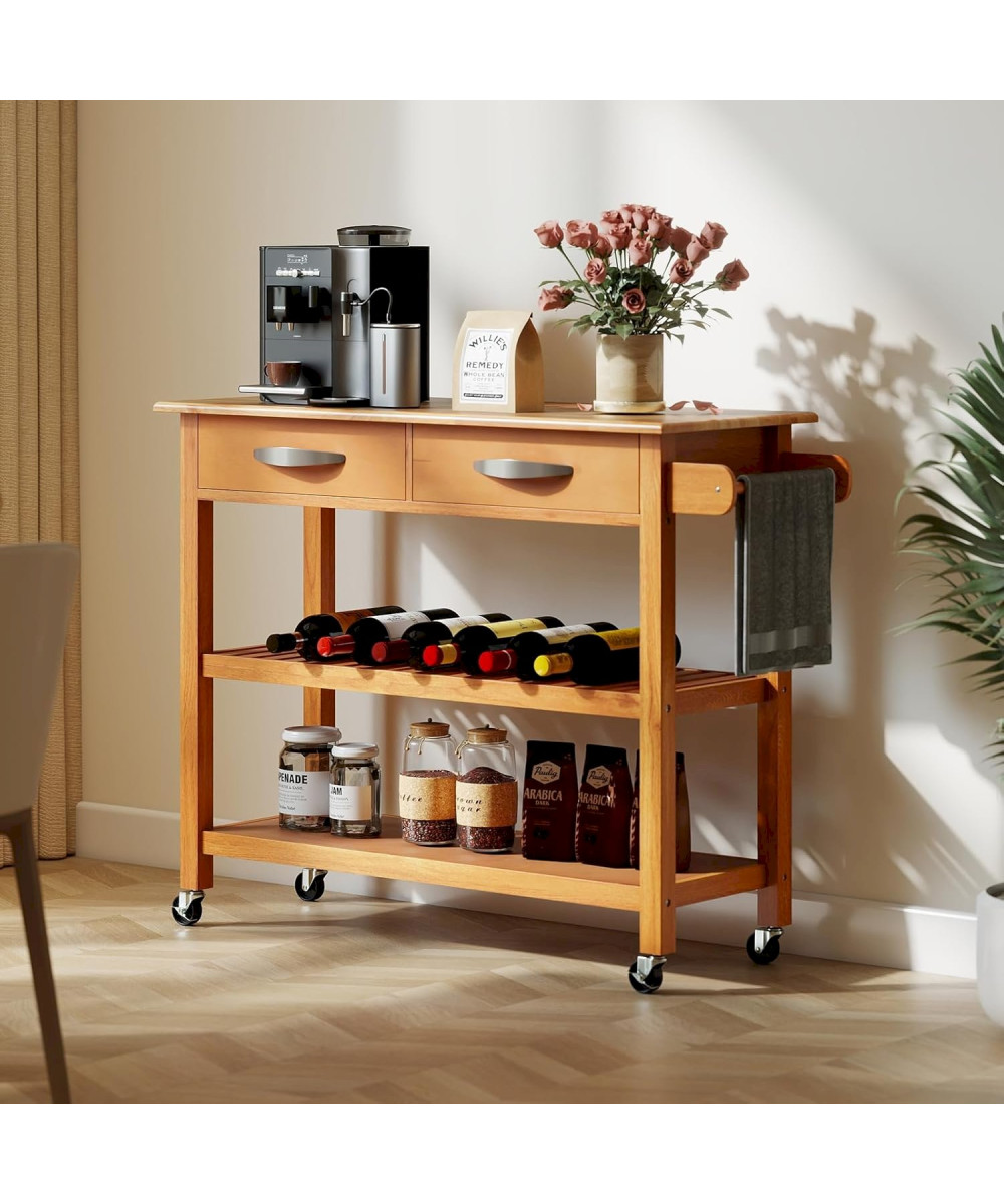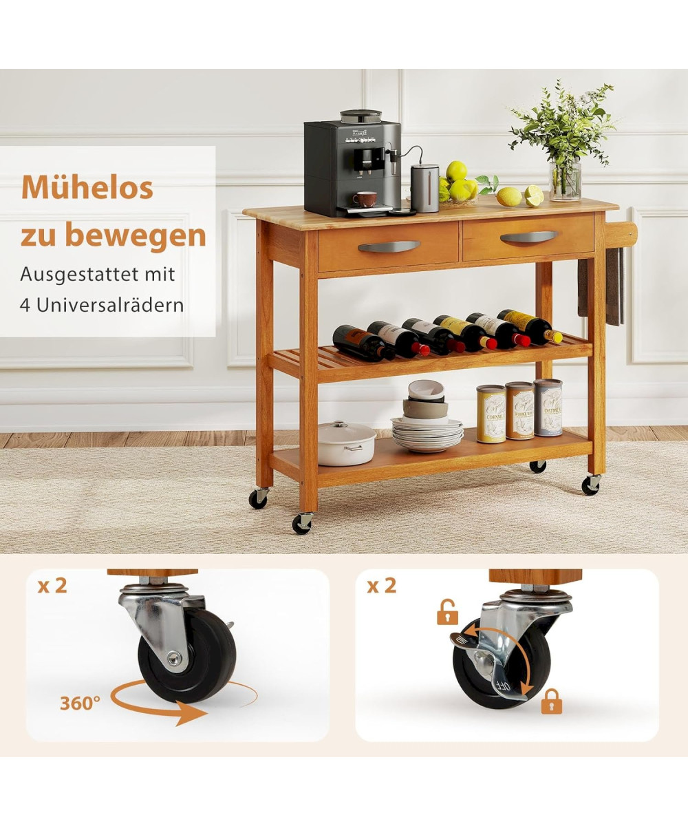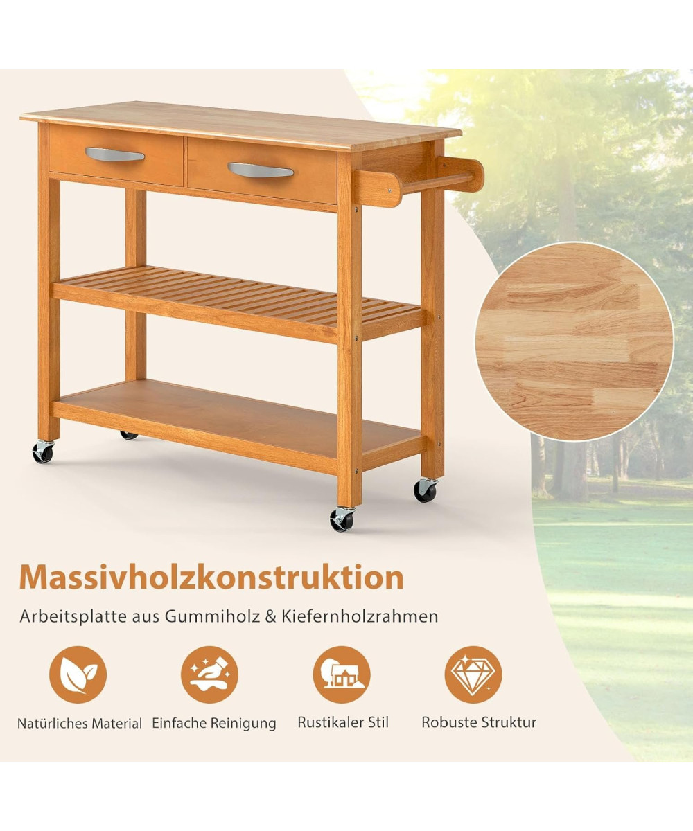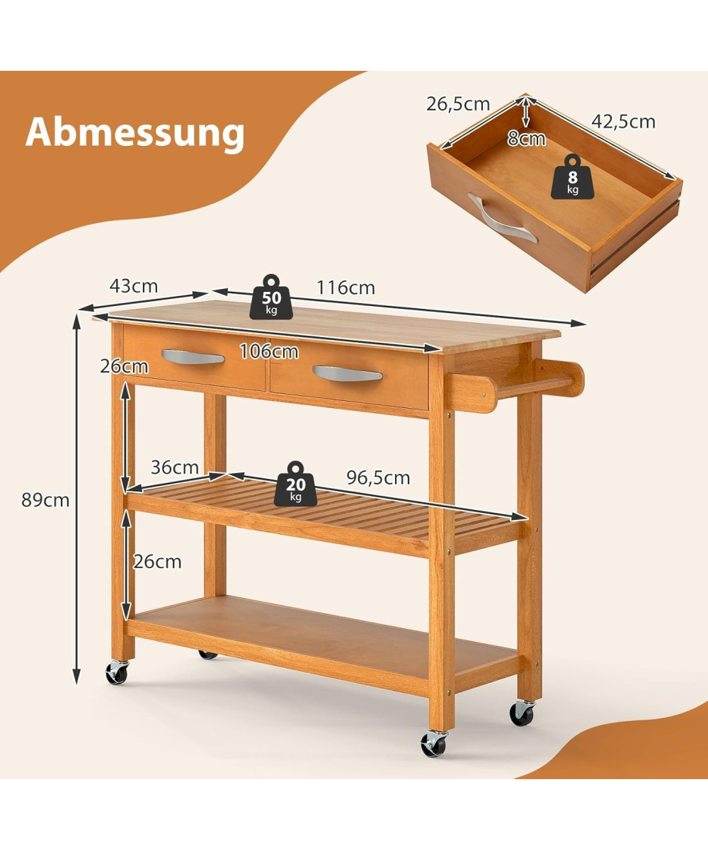 Küchenwagen mit Arbeitsplatte, 2 Schubladen und 2 Ablagen 116x43x89cm Naturholz - Servierwagen mit Rollen