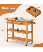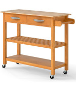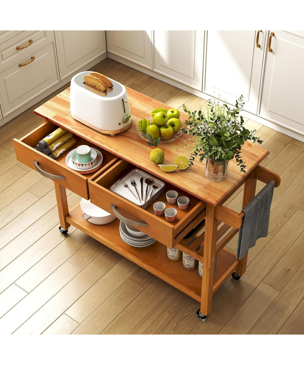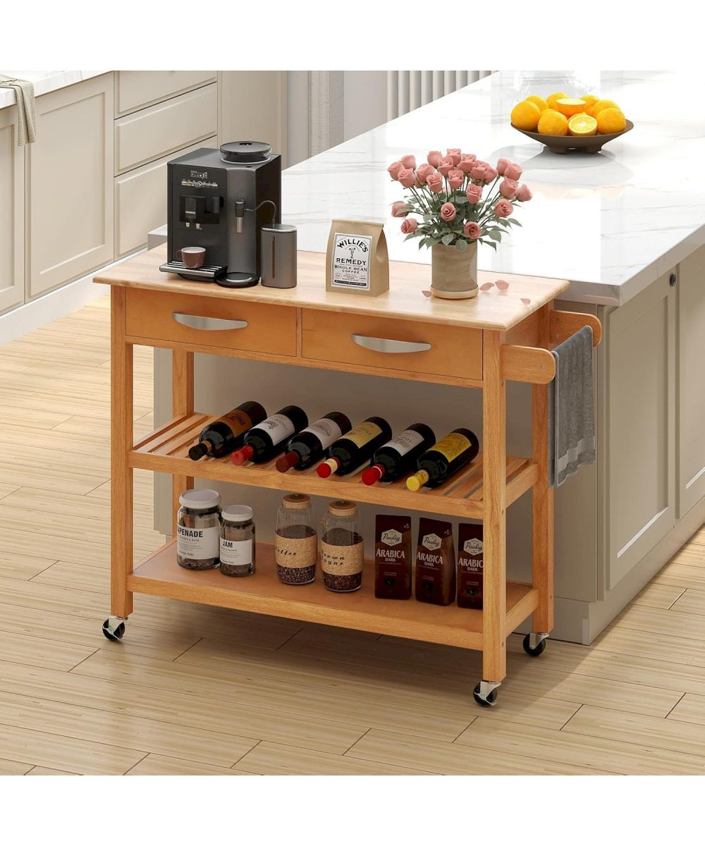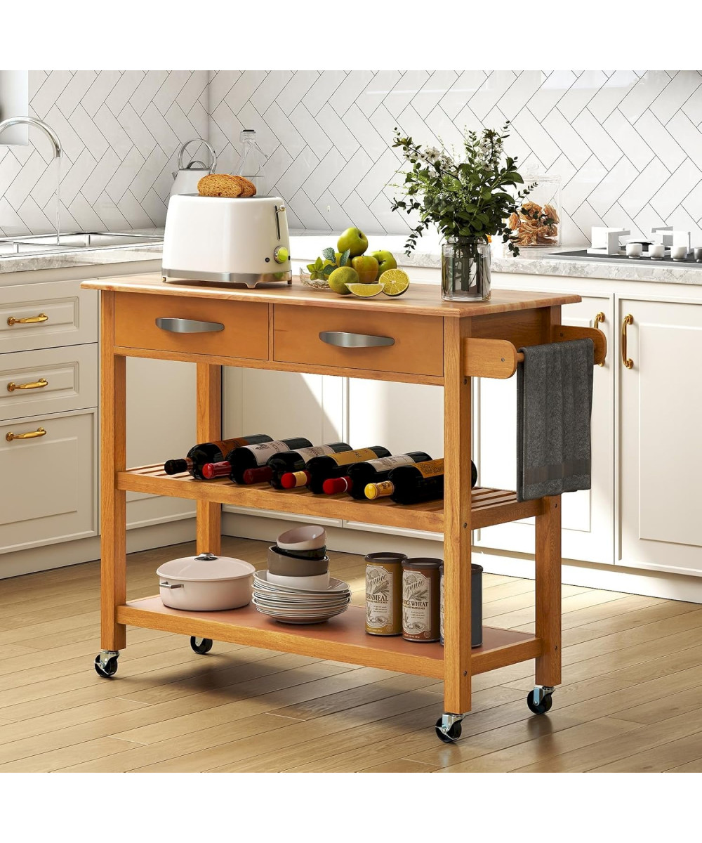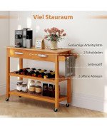 Küchenwagen mit Arbeitsplatte, 2 Schubladen und 2 Ablagen 116x43x89cm Naturholz - Servierwagen mit Rollen