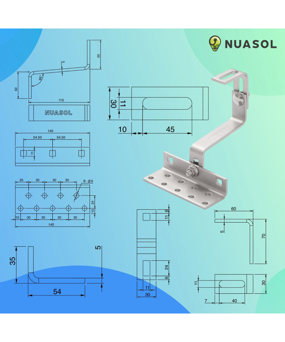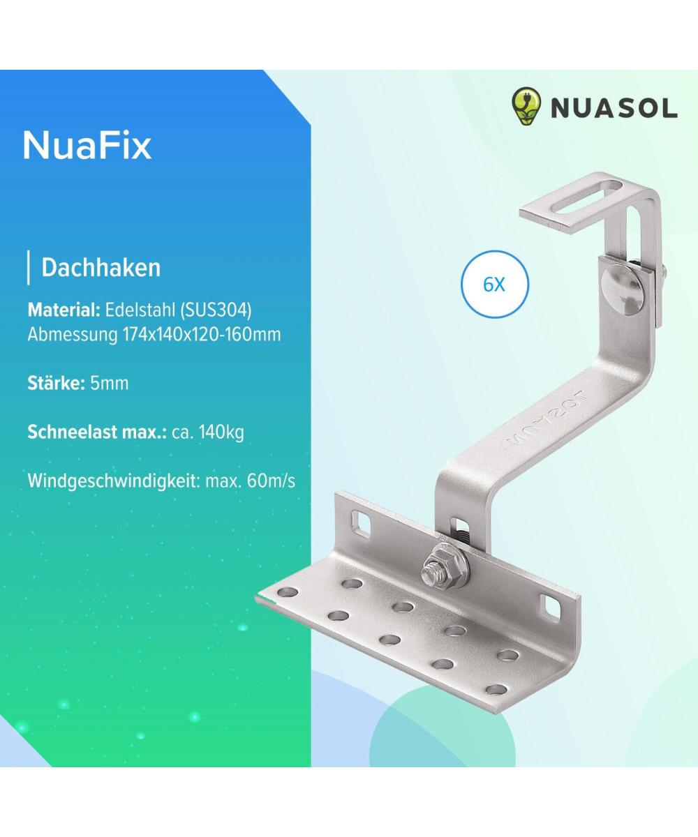 NuaSol bittet Ihnen unterschiedliche Montagematerialien für die Anbringung Ihrer Mini-PV-Anlage oder Ihres Balkonkraftwerkes. Von Stockschrauben über Dachhaken bis hin zu Z-Winkeln, bei uns finden Sie für jede Anbringungsart das passende Montagematerial.