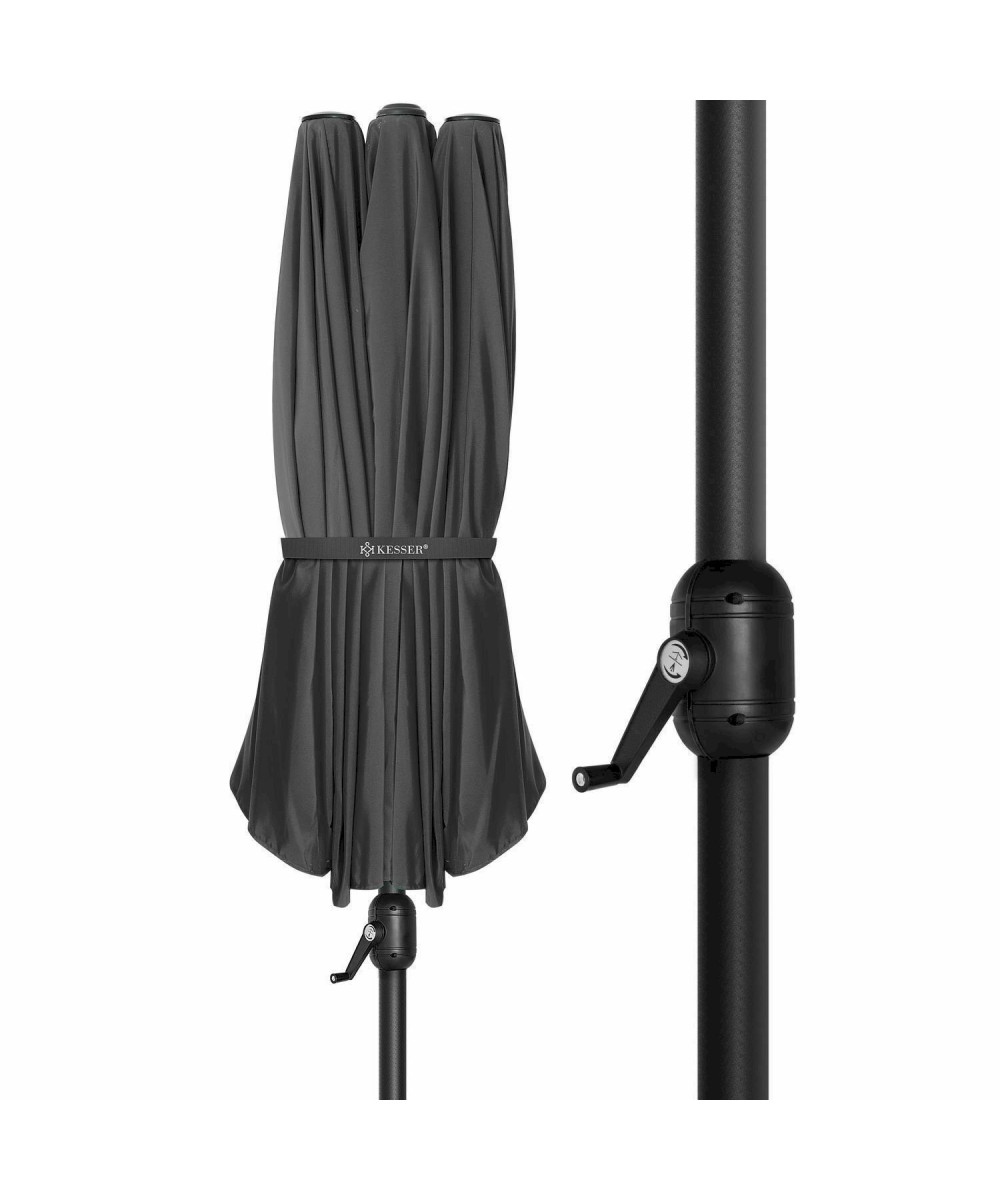 Doppelt hält besser ! Für alle, die ein wenig mehr Schatten suchen, bietet sich unser hochwertiger KESSER Doppelsonnenschirm an. Im Garten , auf der Terrasse , Balkon , am Strand oder beim Camping macht Ihr Schirm immer eine gute Figur. Das Öffnen und Schließen erfolgt dabei kinderleicht mittels der angebrachten Handkurbel . Für hohe Stabilität sorgen zwölf hochwertige Metallstreben . Dank des wasserabweisenden und UV-beständigen Schirmbezugs sind Sie gegen spontanen Regen und starke Sonnenstrahlung immer gewappnet.