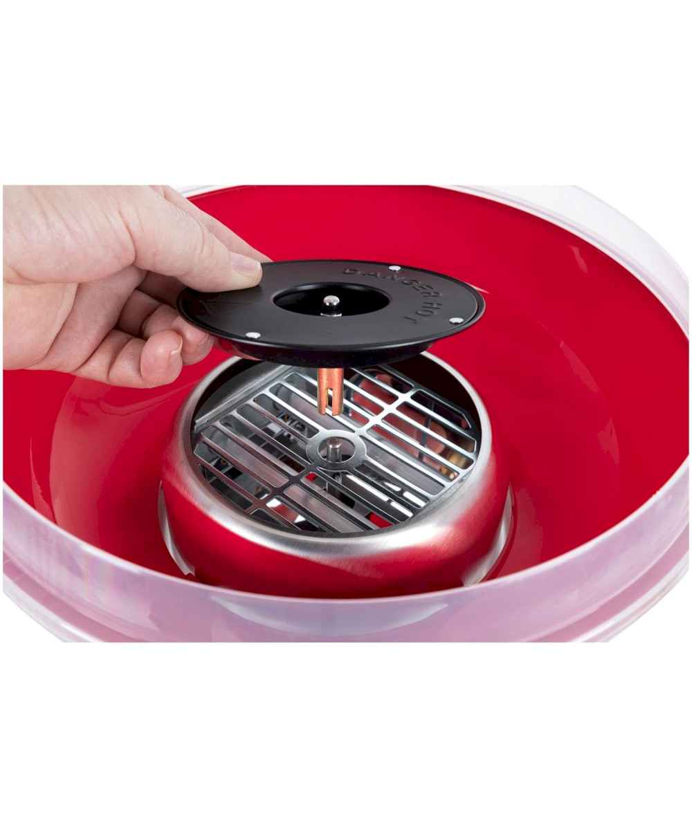 Sobald sich die ersten Zuckerfäden zeigen, das Stäbchen immer schön im Kreis drehen, um die Fäden aufzunehmen. Tipp: den Stab zusätzlich in den Fingern drehen, dann wird das Aufnehmen leichter und die Watte größer. Nach Benutzung können die Einzelteile einfach separat gespült und abgewischt werden.