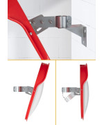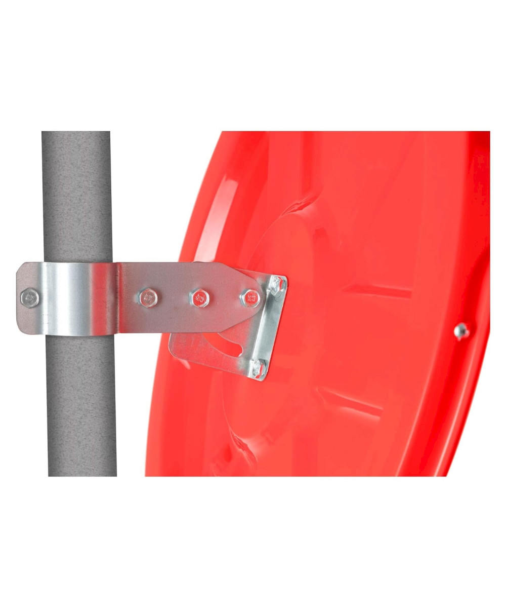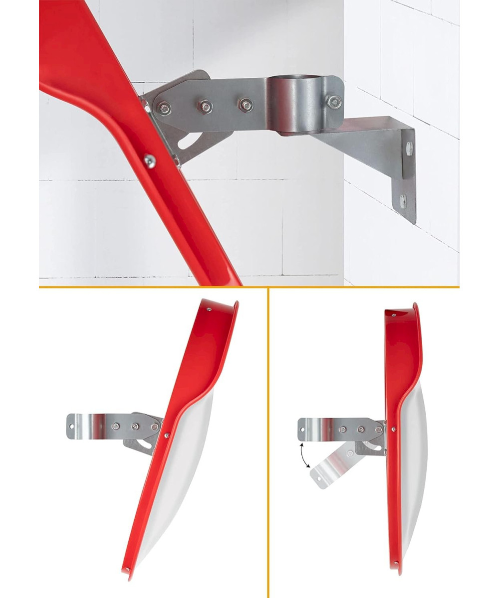 Der Weitwinkelspiegel ist einfach und schnell montiert. Entweder wird er direkt an Rohre und Masten geklemmt oder mit dem beiliegenden Adapter an eine Wand oder Decke geschraubt. Die Neigung des Spiegels kann dabei zusätzlich um bis zu 70° nach unten justiert werden.