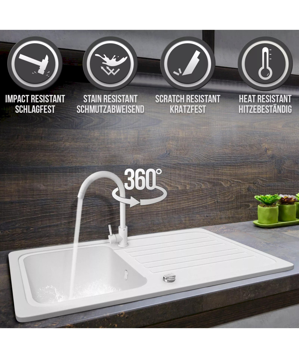 Aquamarin Granitspüle + Siphon Weiss 57x45cm Einbauspüle Küchenspüle Spülbecken Wasserhahn