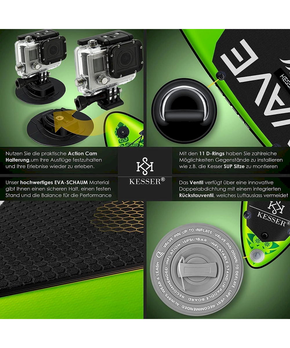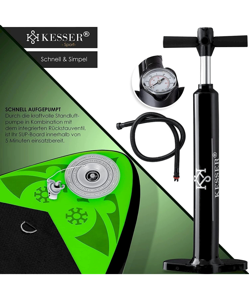 - INNOVATIVE TECHNIK: Das KESSER SUP Board ist mit der mitgelieferten kraftvollen Standluftpumpe mit Druckanzeige schnell aufgeblasen und sofort startbereit. In Kombination mit dem integrierten Rückstauventil, ist Ihr SUP-Board innerhalb von 5 Minuten einsatzbereit. Einen Vorteil bietet die innovative Doppelabdichtung mit einem integrierten Rückstauventil, welches Luftauslass vermeidet und dadurch einen längeren Paddelspaß garantiert.