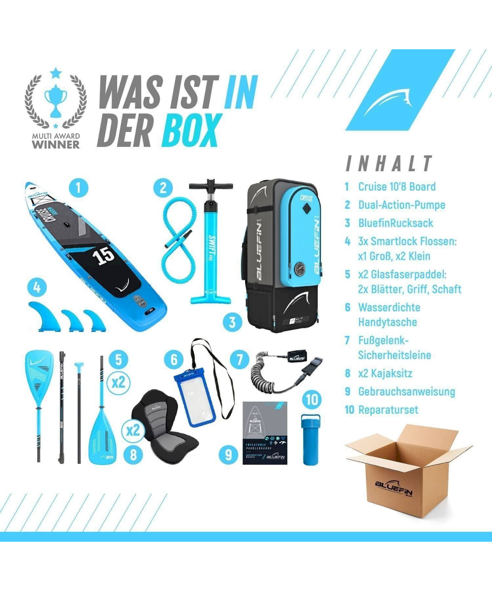 Un das Beste ist, dass Cruise ist ab Tag 1 bereit, da alles was Sie brauchen bereits in der Box enthalten ist. Entdecken Sie alles, was Stand-Up-Paddleboarding auf einem hochmodernen Brett, aus welchem Sie nicht herauswachsen werden und welches nicht so viel kostet wie ein Auto, zu bieten hat.