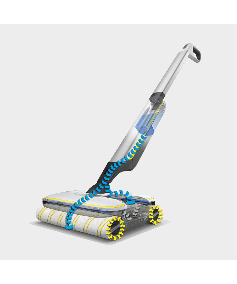 2-Tank-System: permanente Befeuchtung der Walzen aus dem Frischwassertank, während der Schmutz im Schmutzwassertank gesammelt wird. Mühelos: kein Eimerschleppen, kein händisches Auswringen des Bodentuchs, kein Schrubben. Walzen in Waschmaschine bei 60 °C waschbar. - Selbststehend und leicht manövrierbar
