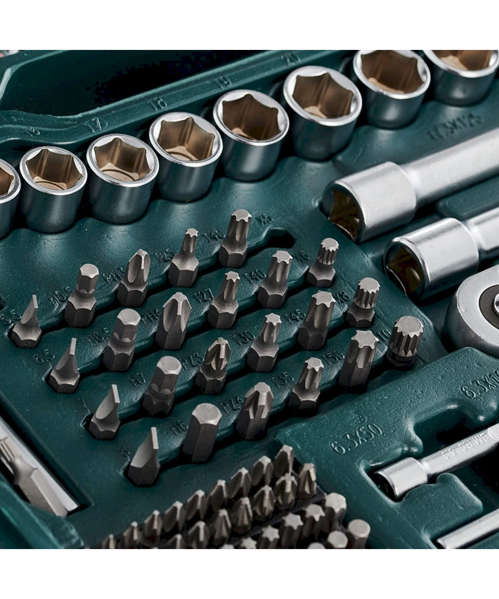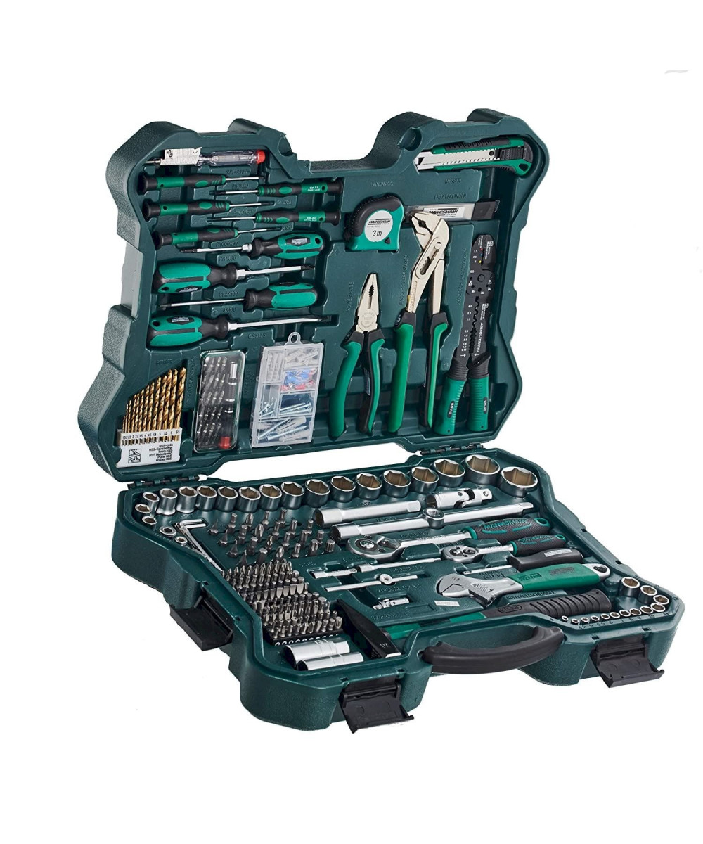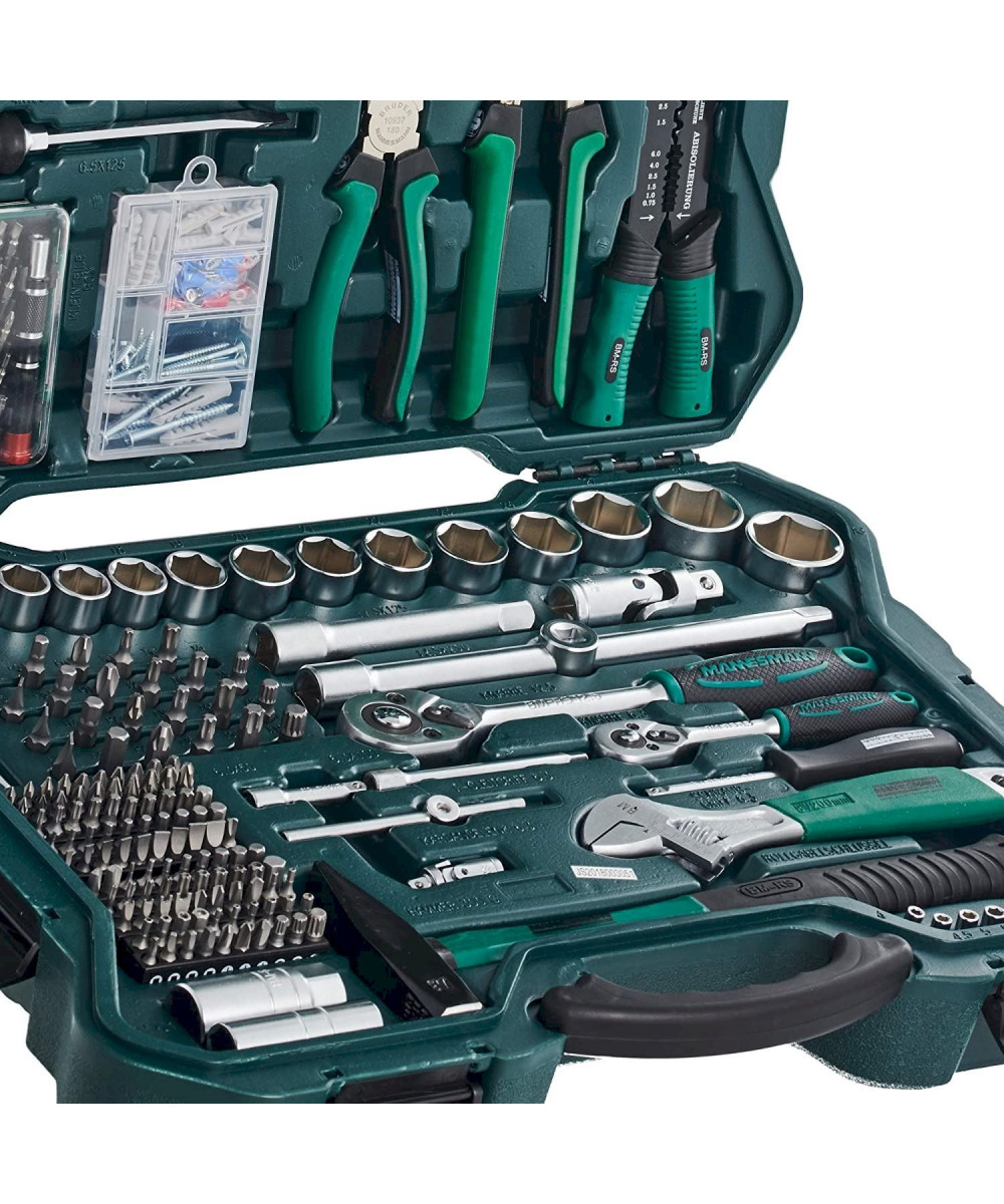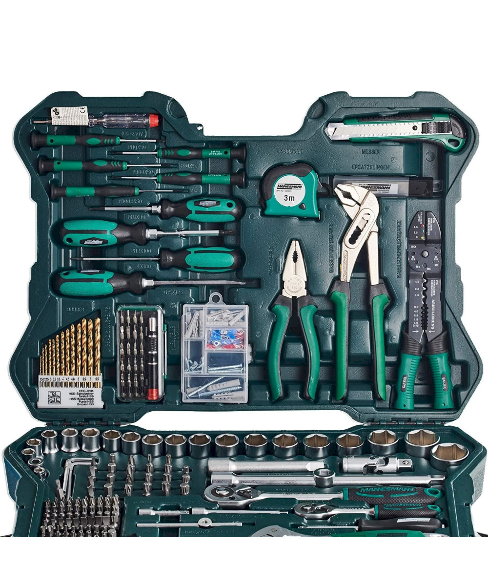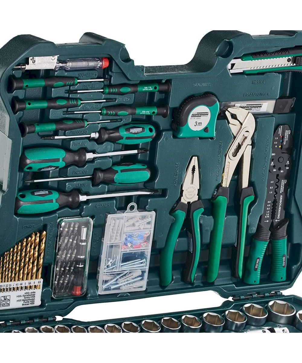 Lieferumfang 5x Feinmechaniker-Schraubendreher 2x Schlitz: 0,4x2,5x50mm + 0,5x3,0x50mm 3x Kreuz:PH000x50mm, PH00x50mm + PH0x50mm 4x Schraubendreher: 2x Schlitz: 0,8x4x100mm + 1,2x6,5x125mm 2xKreuz: PH1x80mm + PH2x100mm 13x HSS Bohrer, Titan beschichtet, in Kunststoff-Aufbewahrungskassette, 1,5mm,2mm,2,5mm,3mm,3,2mm,3,5mm,4mm, 4,5mm, 4,8mm,5mm,5,5mm,6mm,6,5mm 65-tlg Kleinteilesortiment in Klarsichtbox 21-tlg Feinmechaniker-Bit-Set in Klarsichtbox: Schlitz: 1,5mm,2mm,2,5mm,3mm,3,5mm,4mm, Kreuz:PH000,PH00,PH0,PH1, Pozidriv: PZ0,PZ1, T-Profil:T5,T6,T7,T8,T9,T10,T15,T20, 1xAluminium-Schraubgriff 1x Abbrechmesser 18mm 10x Ersatzklingen 18mm im Köcher 1x Spannungsprüfer 1x Stahlbandmaß, 3mx16mm 1x Kombizange 180mm ( 7") 1x Wasserpumpenzange250mm ( 10") 1x Kabelschuhklemmzange 13x Sechskant-Steckschlüsseleinsatz mit Flankenschutz, 6,3mm ( 1/4") Antrieb: 4mm,4,5mm,5mm,5,5mm,6mm,7mm,8mm,9mm,10mm,11mm,12mm,13mm,14mm 18x Sechskant-Steckschlüsseleinsatz mit Flankenschutz 12,5mm ( 1/2") Antrieb: 10mm,11mm,12mm,13mm,14mm,15mm,16mm,17mm,18mm,19mm,20mm,21mm,22mm,23mm,24mm,27mm,30mm,32mm 4xVerlängerung: 6,3mm(1/4")x50mm, 6,3mm(1/4")x100mm,12,5mm(1/2")x125mm,12,5mm(1/2")x250mm 1x T-Gleitgriff-Adapter 12,5mm(1/2")x10mm(3/8") 1xKardangelenk 6,3mm(1/4") 1xKardangelenk 12,5mm(1/2") 1xT-Gleitgriff 6,3mm(1/4") 2xUmschaltknarre 6,3mm(1/4") + 12,5mm(1/2") 2xZündkerzeneinsatz 12,5mm(1/2"): 16mm + 21mm 24xSchraubendreher-Bits, 8x30mm: 8xT-Profil:T25,T27,T30,T35,2xT40,T45,T50 2xKreuz: PH3,PH4 2xPozidriv:PZ3,PZ4 4xInnensechskant:5,5mm,6,5mm,7mm,8mm 4xSchlitz:5,5mm,6,5mm,7mm,8mm 4xVielzahn:5mm,6mm,8mm,10mm 2xBitadapter:6,3mm(1/4")x6,3mm + 12,5mm(1/2")x8mm 1xSchraubgriff 6,3mm(1/4") Bitset 100tlg. 7xInnensechskantschlüssel:1,27mm,1,5mm,2mm,2,5mm,3mm,4mm,5mm 1xRollgabelschlüssel 200mm ( 8") 1xSchlosserhammer mit Fiberglasstiel 300g.