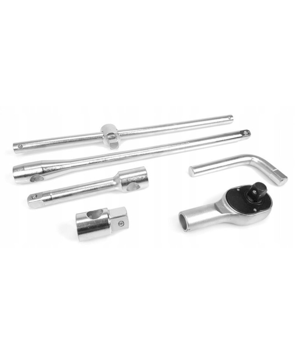 Steckschlüsselsatz bestehend aus 26 Elementen. Das Set beinhaltet einen Satz mit 6-kant Steckschlüssel mit 3/4 "und 1" -Buchsen, einen T-Knopf (3/4 "), ein Ratsche (3/4"), einen Satz Verlängerungen (3/4 ") und eine 1" -Tülle. Alle Elemente des Sets bestehen aus hochwertigem CrV-Chrom-Vanadium-Stahl. Das Ganze befindet sich in einem praktischen Koffer aus strapazierfähigem Kunststoff.