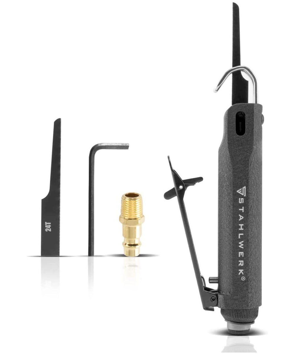 - Robuste, leistungsstarke Mini-Druckluft-Stichsäge mit bis zu 9.000 Hüben/min.