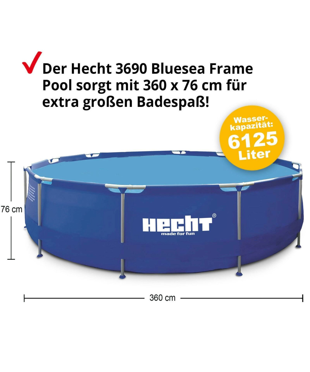 Der HECHT 3690 BLUESEA ist mit 360 x 76 cm extra groß und bietet ausreichend Platz für puren Badespaß. Im Becken haben bis zu 6.125 Liter Wasser Platz.