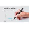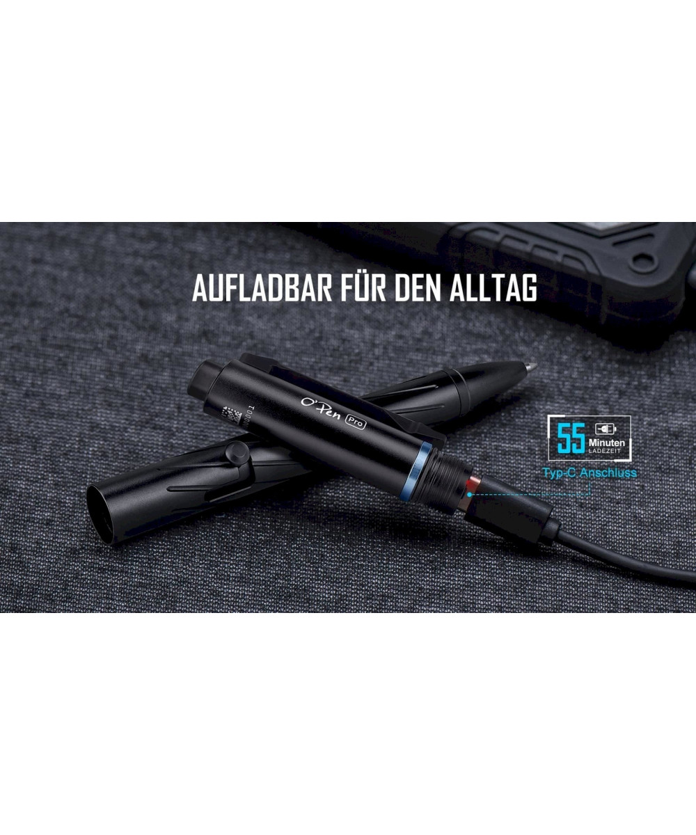 Der Open Pro ist ein Stift für den Alltag, der zusätzlich sowohl über eine LED als auch über einen grünen Laser verfügt. Er kann in zwei Teile zerlegt und separat als Stift und Licht verwendet werden. Das Gehäuse ist im Vergleich zum Open 2 schlanker und länger und bietet so eine bessere Ergonomie. Gleichzeitig wurde die LED (5 bis 120 Lumen) in den Pocketclip integriert, damit das Licht nicht verdeckt wird, wenn der Open Pro an Taschen befestigt ist. Im Lichtteil des Stiftes ist auch ein grüner Laser zum Markieren von Objekten integriert. Mit dem L-Bolzen können Mine, LED und der grüne Laser kontrolliert werden. Der verbaute Lithium-Polymer-Akku, USB-C Anschluss und die Ladestandsanzeige bilden ein stimmiges Bild. Der Open Pro istein robustes und leichtes Stiftlicht für den Alltag, Abenteuer, Reisen, Sicherheitsdienst und natürlich auch fürs Büro. Mit dem Open Pro hast du immer ein Licht dabei.