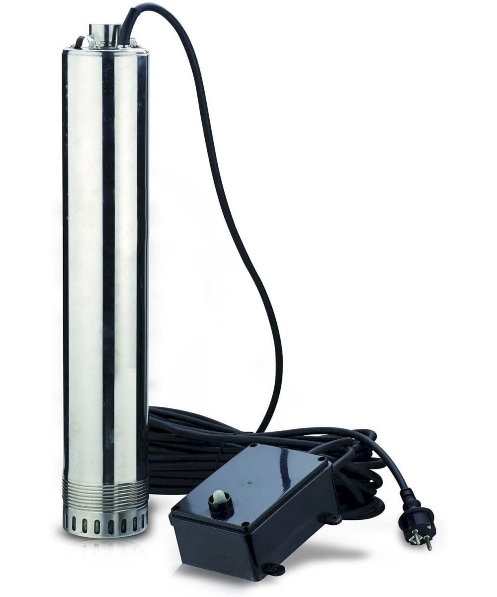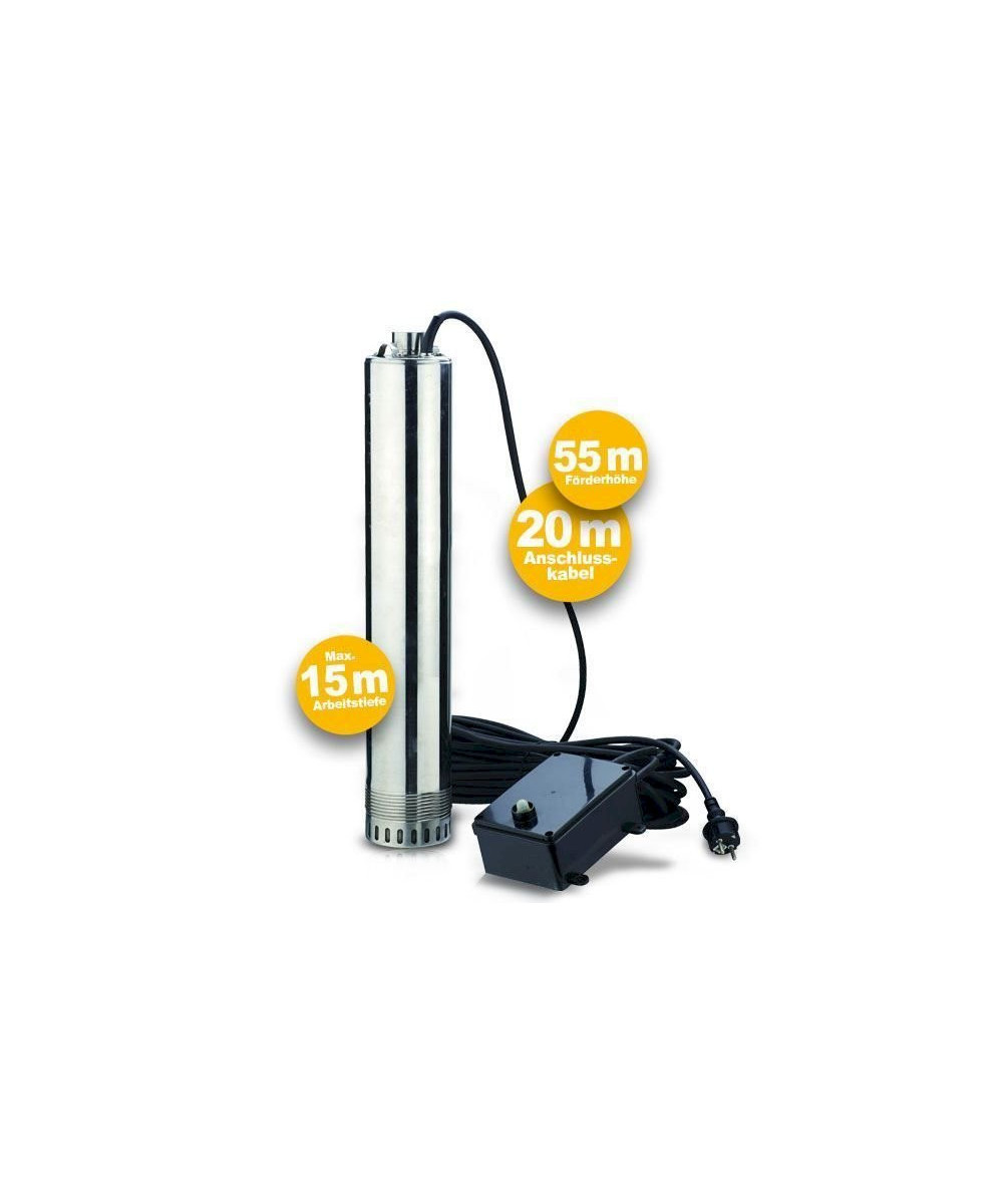 Die Pumpe lässt sich komplett im Boden versenken und Wasser kann aus bis zu 55 m Tiefe gefördert werden. Das Pumpengehäuse ist aus rostfreiem Edelstahl gefertigt.