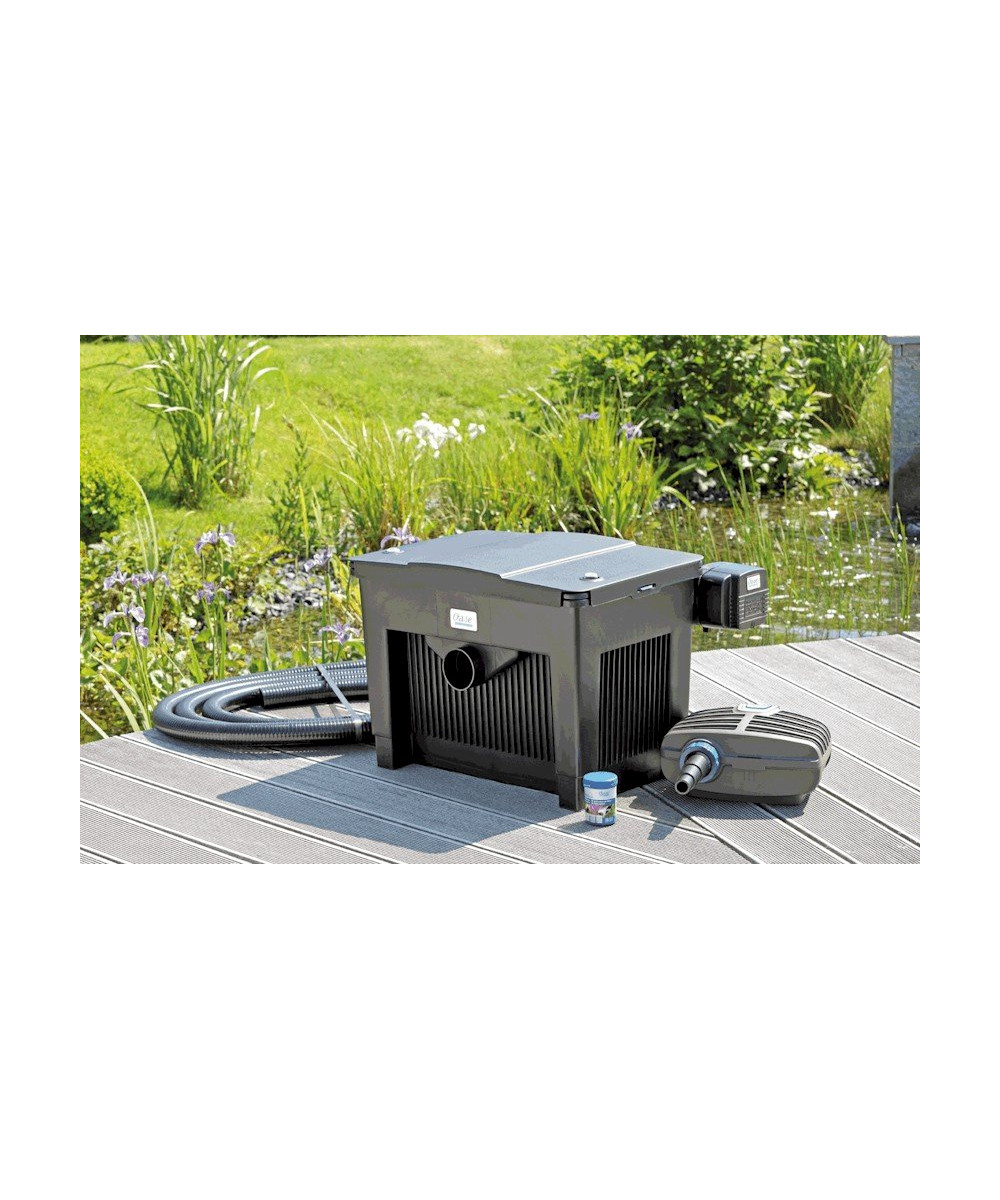 Die mechanisch-biologische Reinigung in den verschiedenen Filterschwämmen wandelt giftige Stickstoffe, die in Ammoniak und Nitrit enthalten sind, in unschädliche Endprodukte um und sorgt für gesundes Teichwasser. Eine spezielle Wasserführung reichert das Teichwasser zusätzlich mit Sauerstoff an.