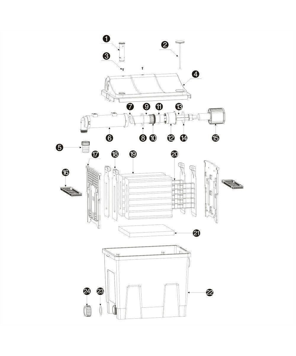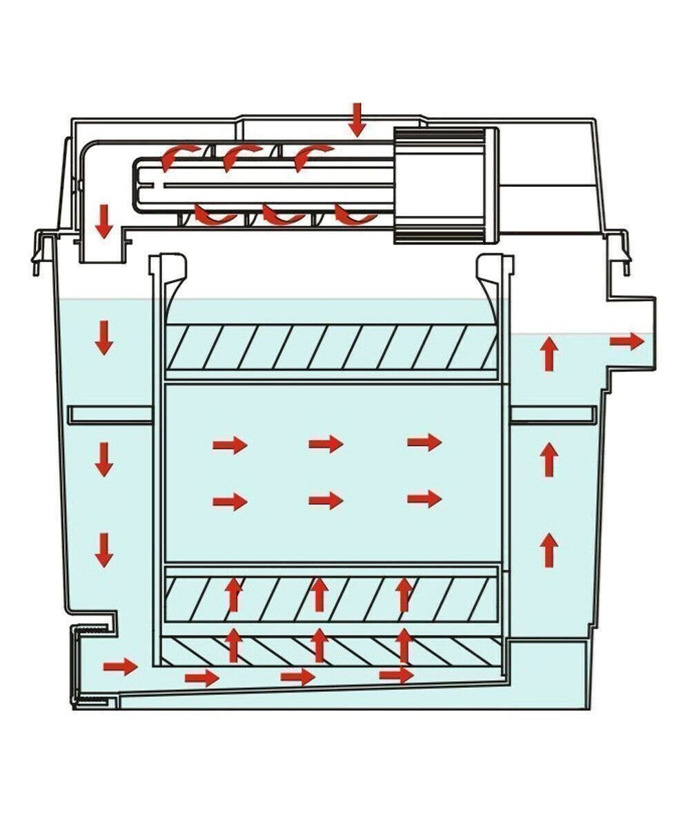 Die effektive Filterung erfolgt durch Materialien wie einen speziellen gelben und einen speziellen blauen Schwamm mit unterschiedlich langen Durchlaufgeschwindigkeiten des Teichwassers, einer Japanmatte und einem UV-C-Klärer .