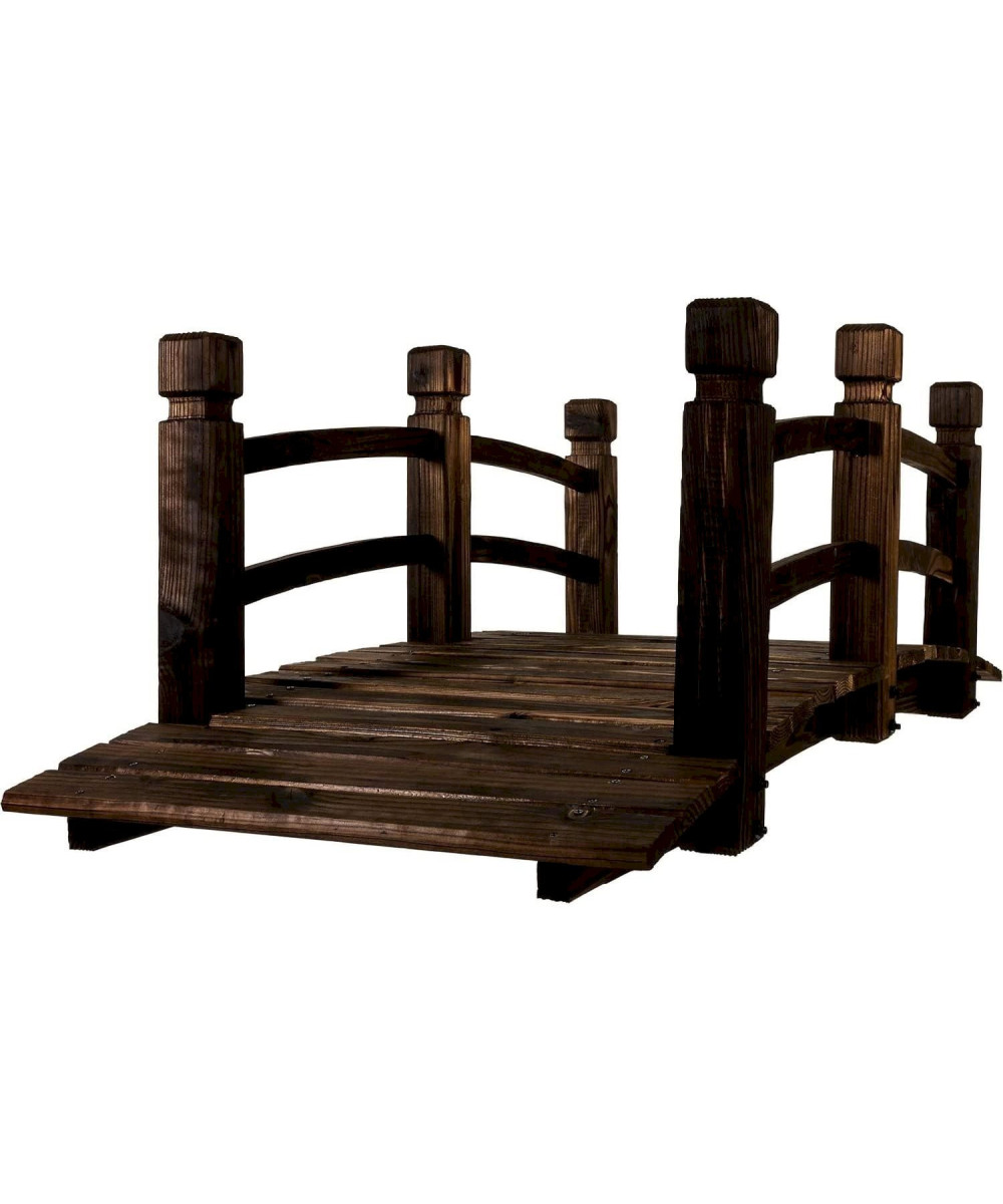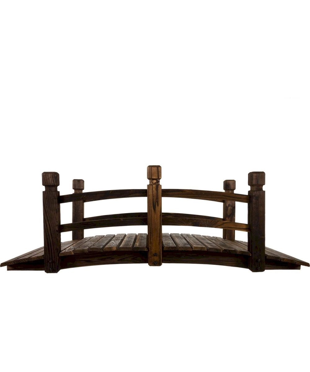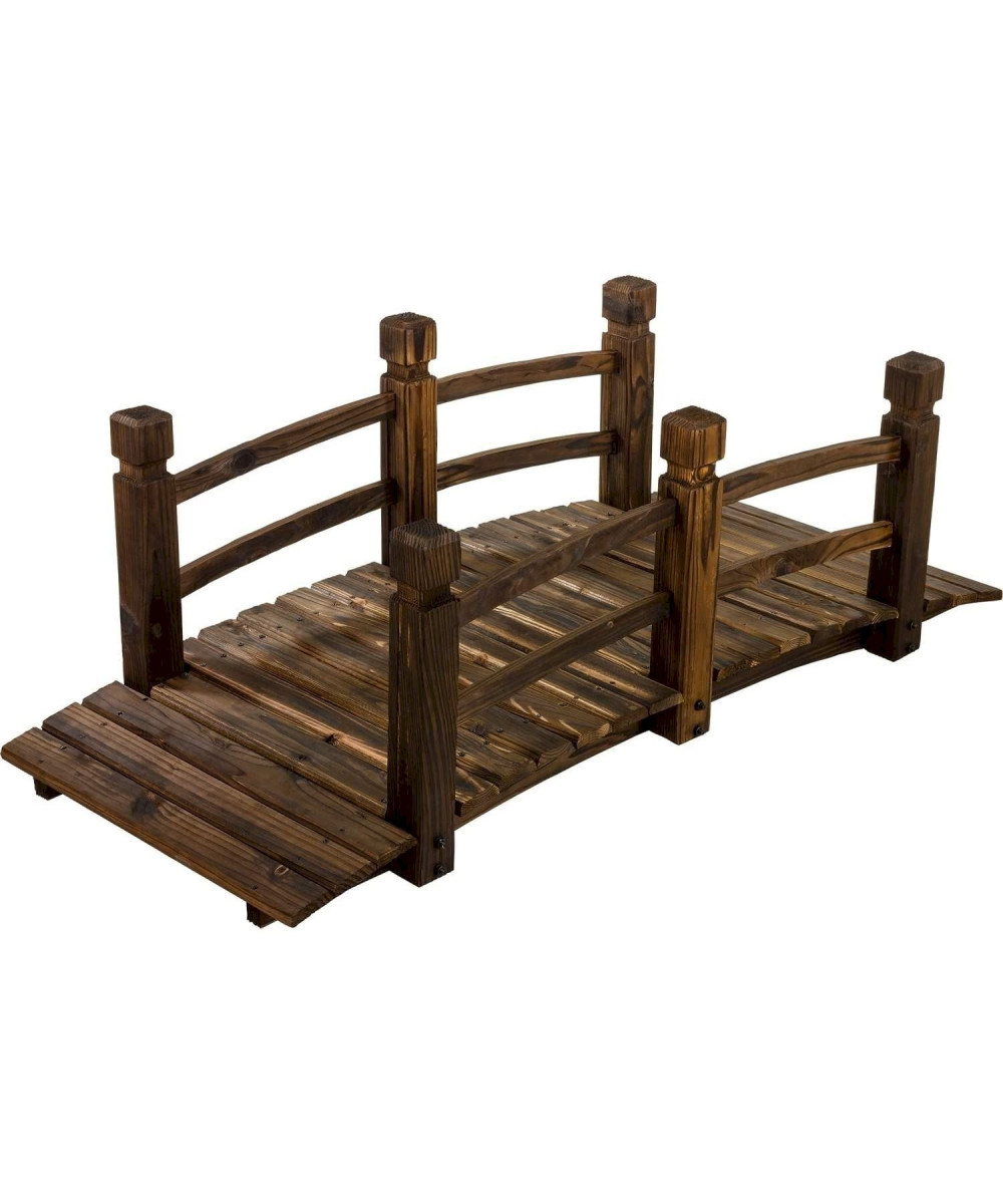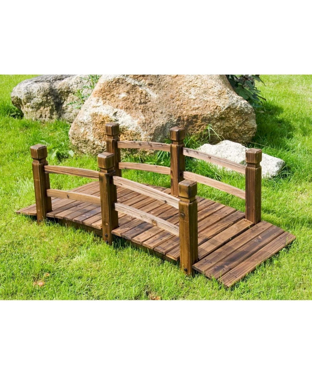 Diese Wunderschöne Brücke aus massivem Holz ist bestens zur Überbrückung eines Blumenbeets oder eines Bachlaufes geeignet, auf alle Fälle jedoch ein dekoratives Highlight in jedem Garten. Den rustikalen Braunton verdankt die Brücke einer speziellen Brandbehandlung, die das Holz zusammen mit der Ölbehandlung besonders witterungsbeständig macht.