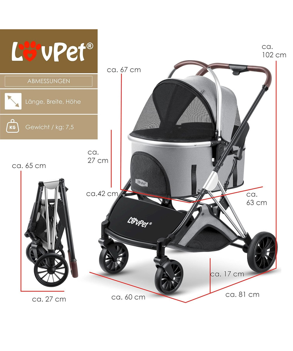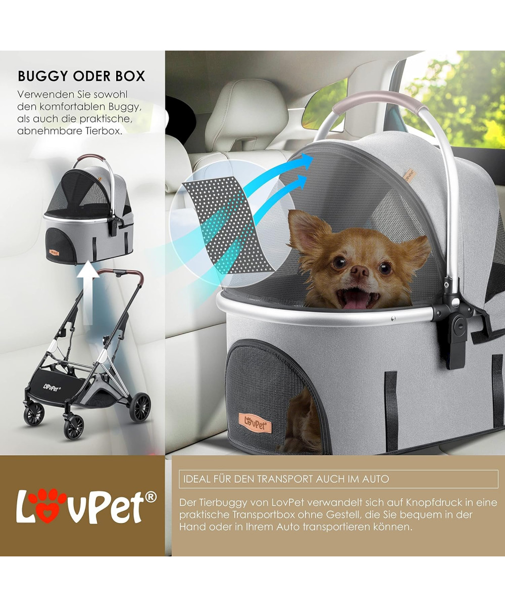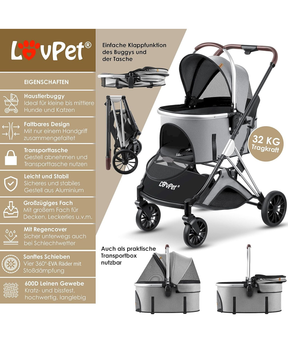 Der Hundekinderwagen der Marke LOVPET verwandelt sich bei Bedarf schnell und unkompliziert in eine Hundetransportbox, diese können Sie ganz bequem in der Hand oder in Ihrem Auto transportieren! Dadurch schränkt Sie Ihr Hund bei keinem Besuch oder Wandertag ein und kann Sie problemlos bei jedem Ausflug begleiten.