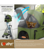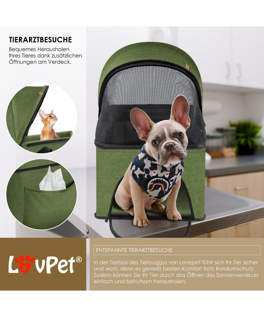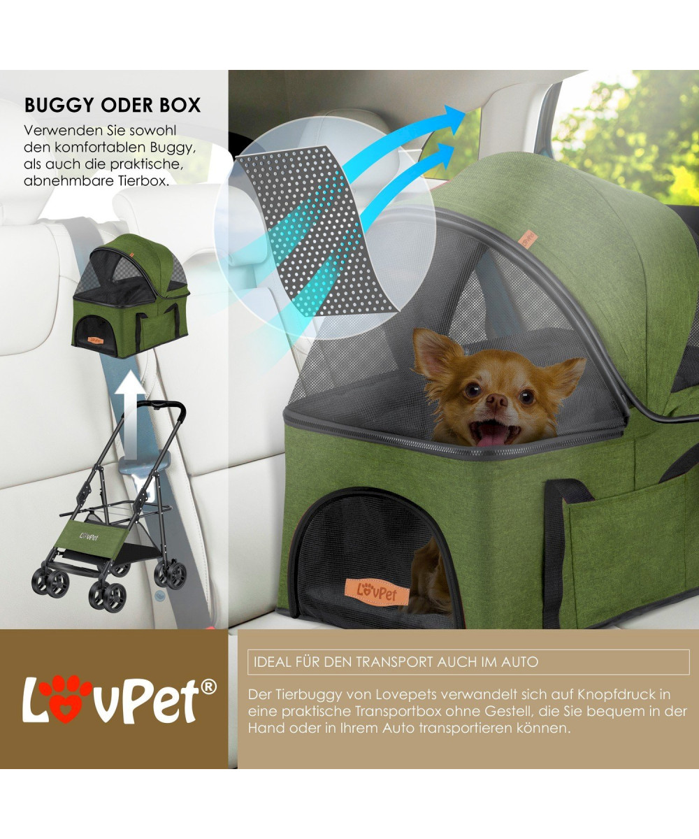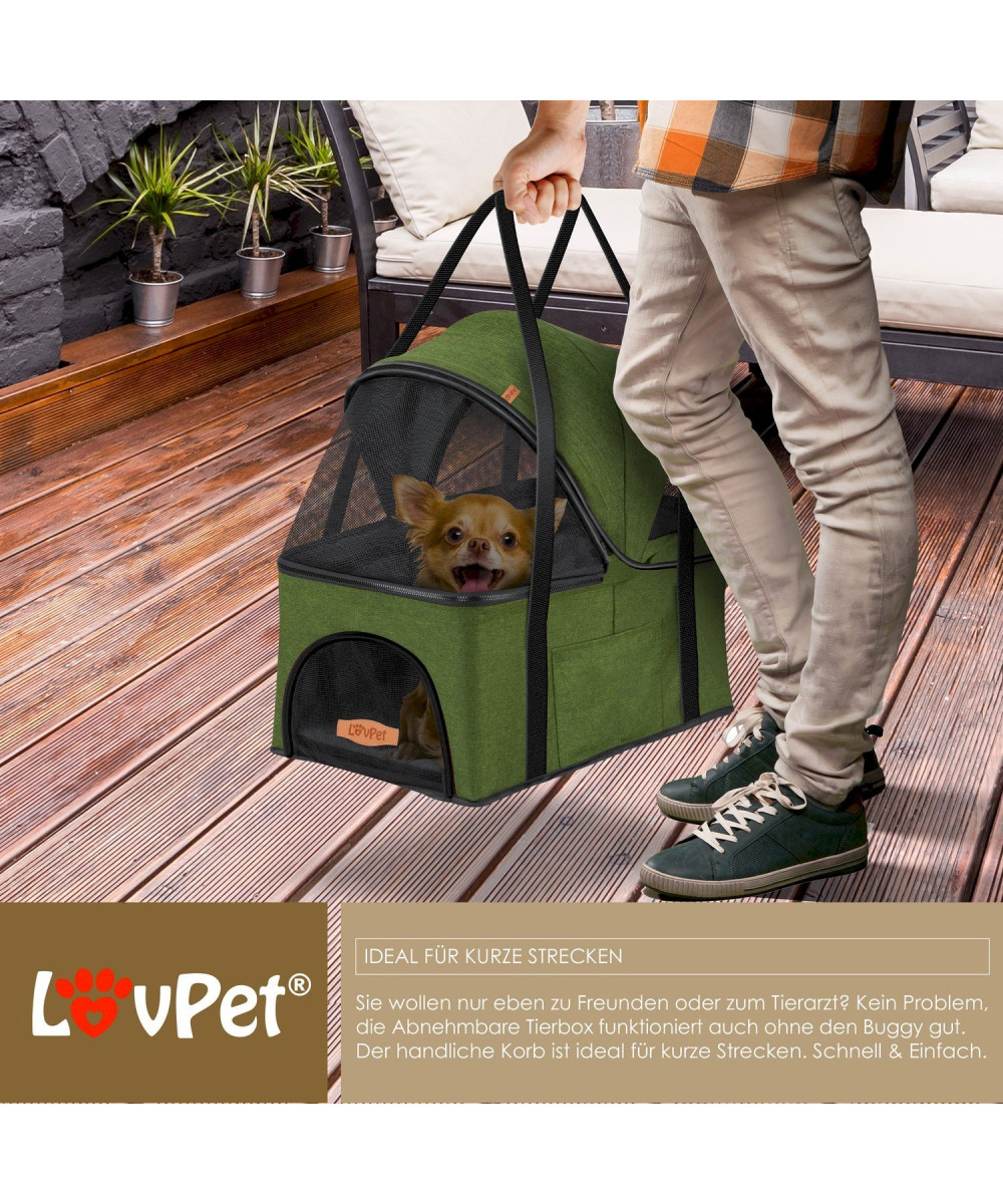 Der Hundekinderwagen der Marke LOVPET verwandelt sich bei Bedarf schnell und unkompliziert in eine Hundetransportbox ohne Gestell, diese können Sie ganz bequem in der Hand oder in Ihrem Auto transportieren! Dadurch schränkt Sie Ihr Hund bei keinem Besuch oder Wandertag ein und kann Sie problemlos bei jedem Ausflug begleiten.
