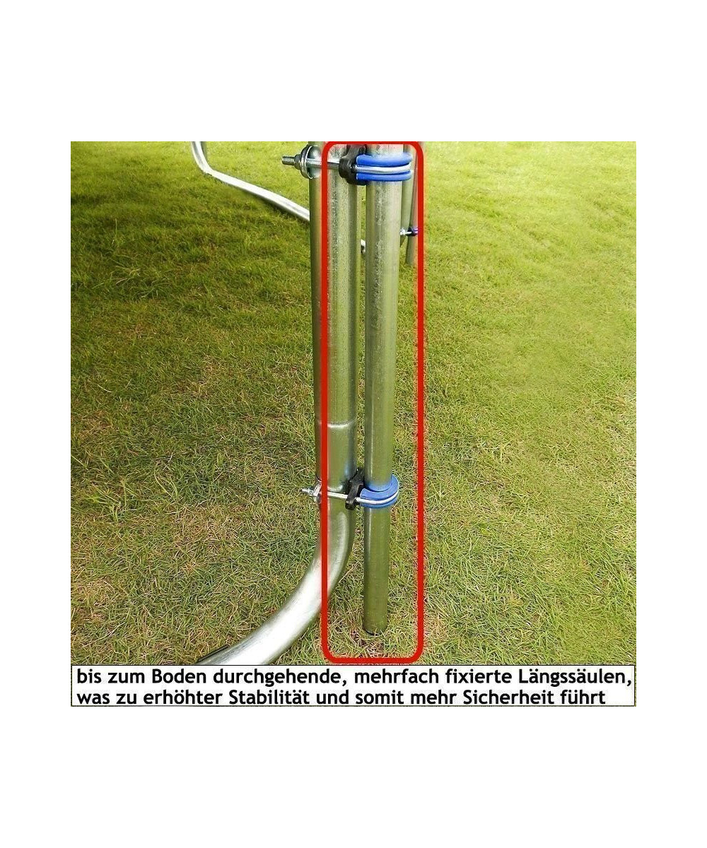 bis zum Boden durchgehende, mehrfach fixierte Längssäulen, was zu erhöhter Stabilität und somit mehr Sicherheit führt.