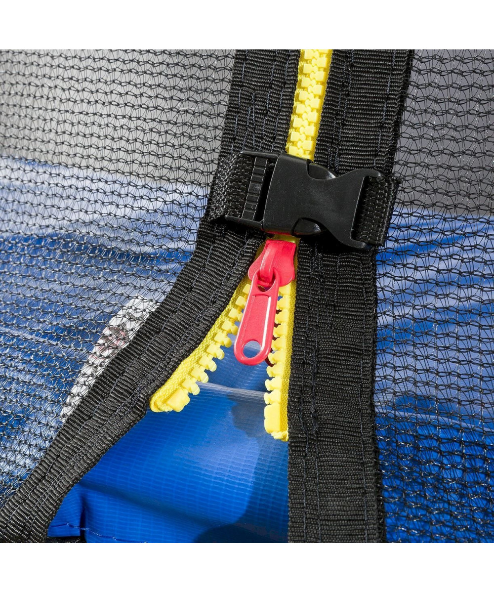 Das Netz ist besonders engmaschig und besitzt einen Eingang, der sich einfach über einen Reißverschluss öffnen und schließen lässt. Um höheren Belastungen standzuhalten, lässt sich dieser zusätzlich über Steckschnallen sichern. Mit Hilfe von Karabinerhaken lässt sich das Netz an der Sprungmatte befestigen.