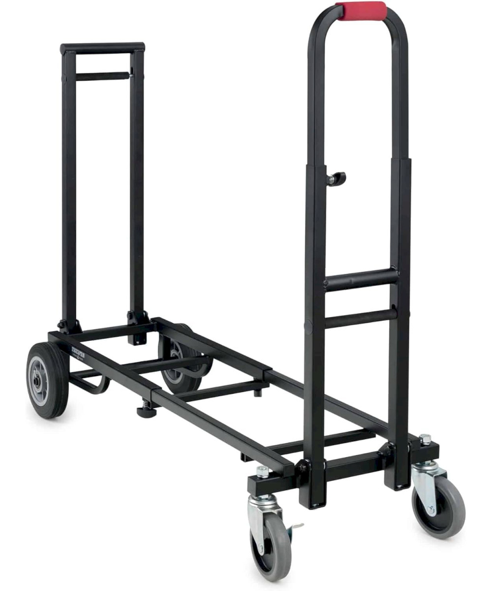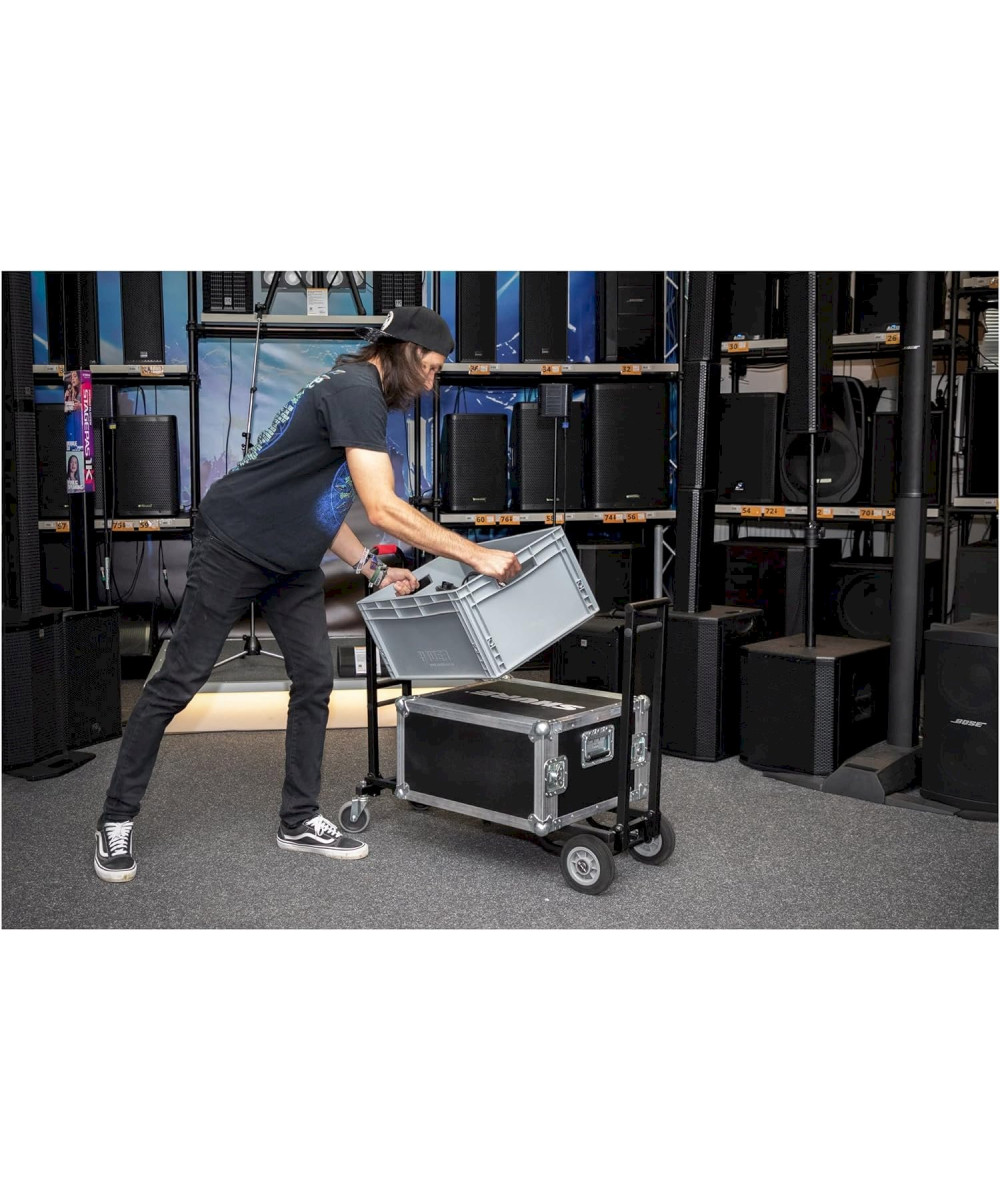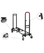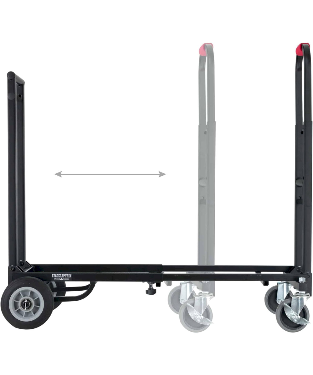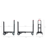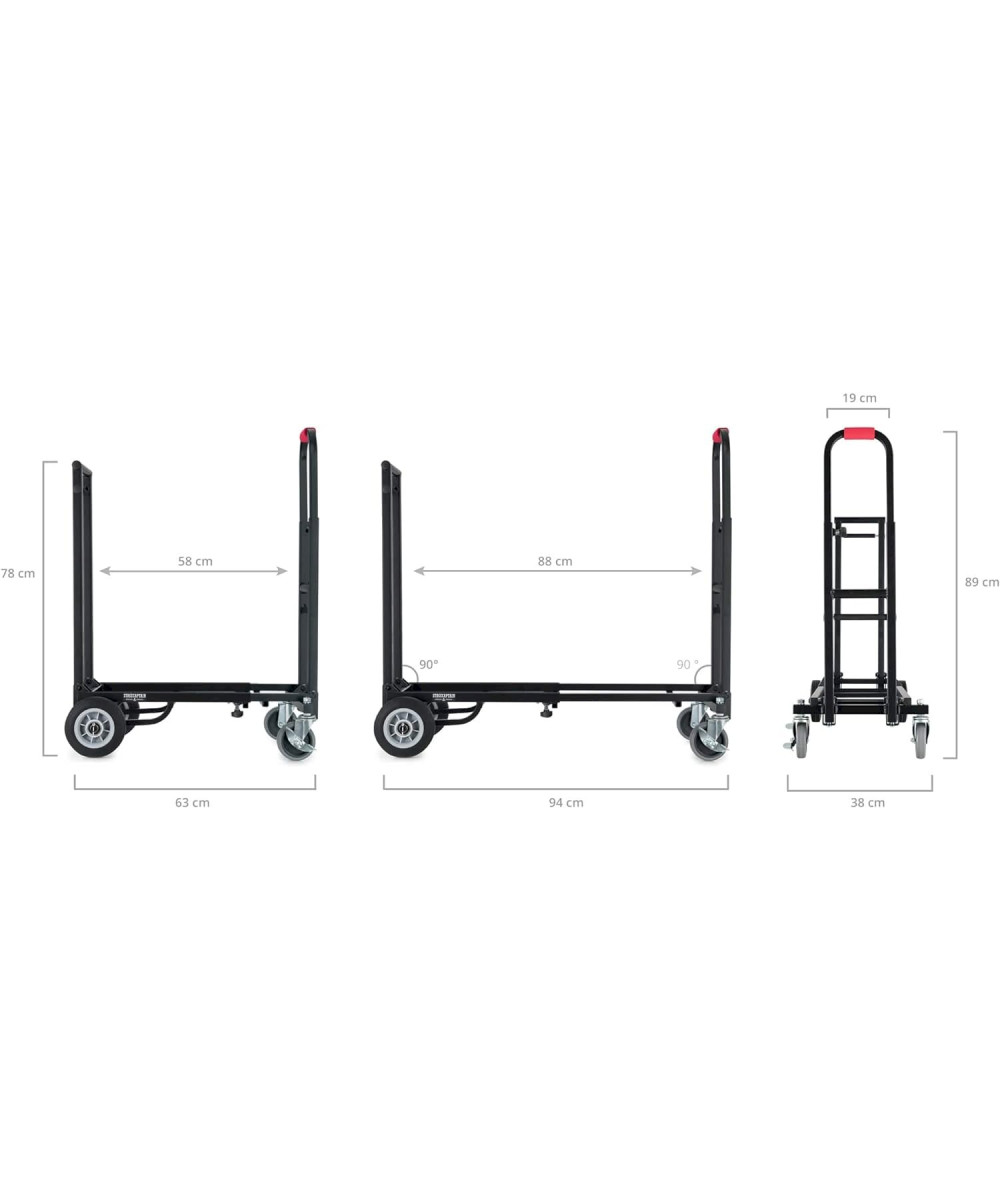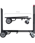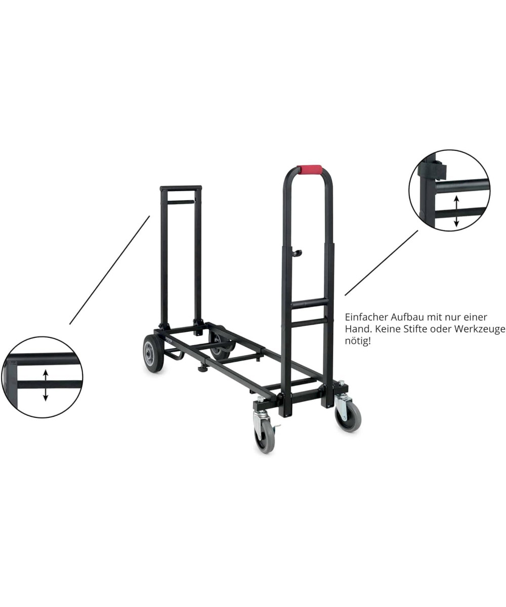 Der Stagecaptain Sherpa Transportwagen meistert mit seinen breiten, extragroßen und kugelgelagerten Gummirädern nahezu jeden Untergrund. Durch lenk- und bremsbare Vorderräder wird die Navigation - auch um scharfe Kurven - zum Kinderspiel. Die ausziehbare Ladefläche kann stufenlos von 58 bis 88 cm eingestellt werden, wodurch der SCS-60 MKII für den Transport von Lasten unterschiedlichster Größe einsetzbar ist. Alternativ kann der Transportwagen auch als klassisches Rollbrett eingesetzt oder durch das Einklappen eines Handgriffs als Sackkarre verwendet werden. Der Trolley lässt sich praktisch zuammenklappen und kann so leicht im Kofferaum transportiert oder bei Nichtgebrauch sehr gut sogar in Schränken verstaut werden.