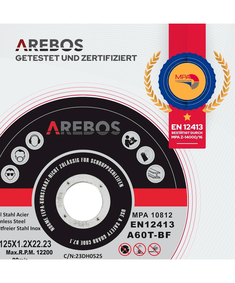 AREBOS Trennscheiben erfüllen die Sicherheitsstandards der EN 12413 (Europäische Norm 12413). Dies wurde vom Materialprüfungsamt (MPA) Hannover getestet und bestätigt.