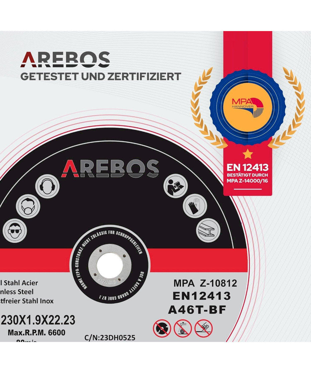 AREBOS Trennscheiben erfüllen die Sicherheitsstandards der EN 12413 (Europäische Norm 12413). Dies wurde vom Materialprüfungsamt (MPA) Hannover getestet und bestätigt.